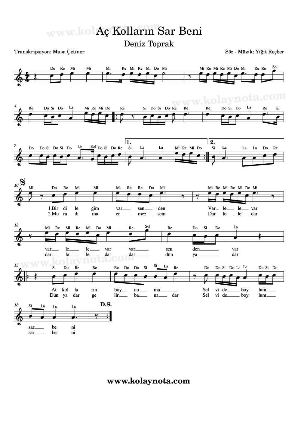 Aç Kolların Sar Beni Nurettin Rençber’in söylediği, türkü formunda bir şarkı. Sözü ve müziği Yiğit Rençber’e ait. Ben Deniz Toprak’ın yorumunu dinleyerek notaya aldım.
