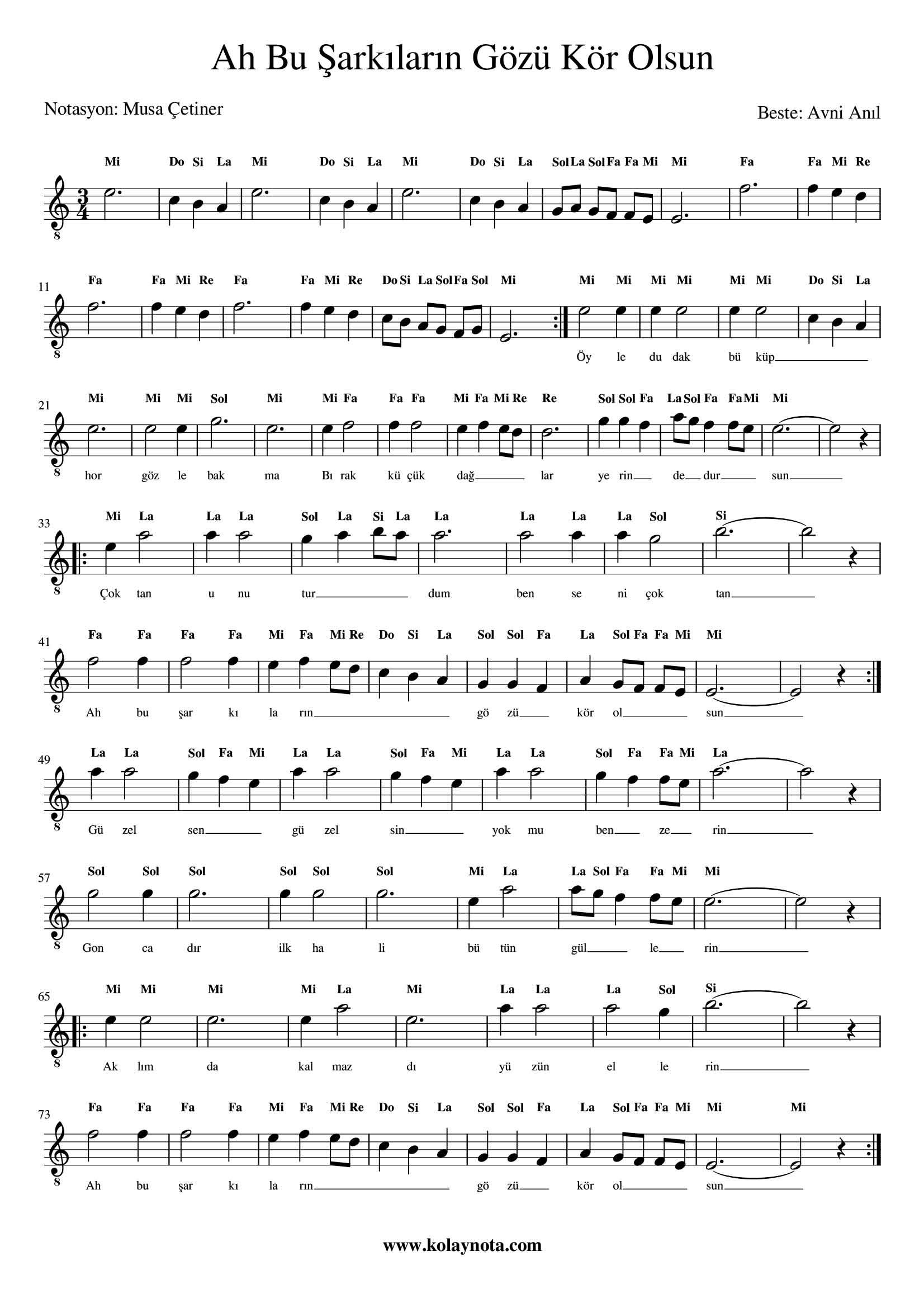 Ah Bu Şarkıların Gözü Kör Olsun; tanınmış bestekar Avni Anıl’ın çok bilinen bir eseri. Do Re Mi ve Kolay notalarını paylaşacağım. İkisi de mi karar olacak. Melodika, keman, org, flüt çalgılarında çalabilirsiniz. Başarılar.