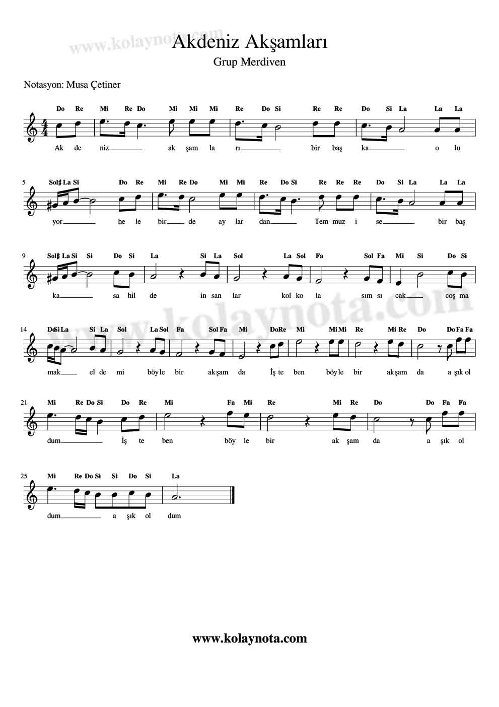 Akdeniz Akşamları; 90’lı yıllarda Grup Merdiven sayesinde tanıdığımız, sonrasında ise Haluk Levent sayesinde daha da popüler hale gelen, herkesin hafızasında yer etmiş güzel bir şarkı. Do re mi nota ve kolay nota olarak paylaşıyorum. Videosunu izleyerek daha kolay çalabilirsiniz.