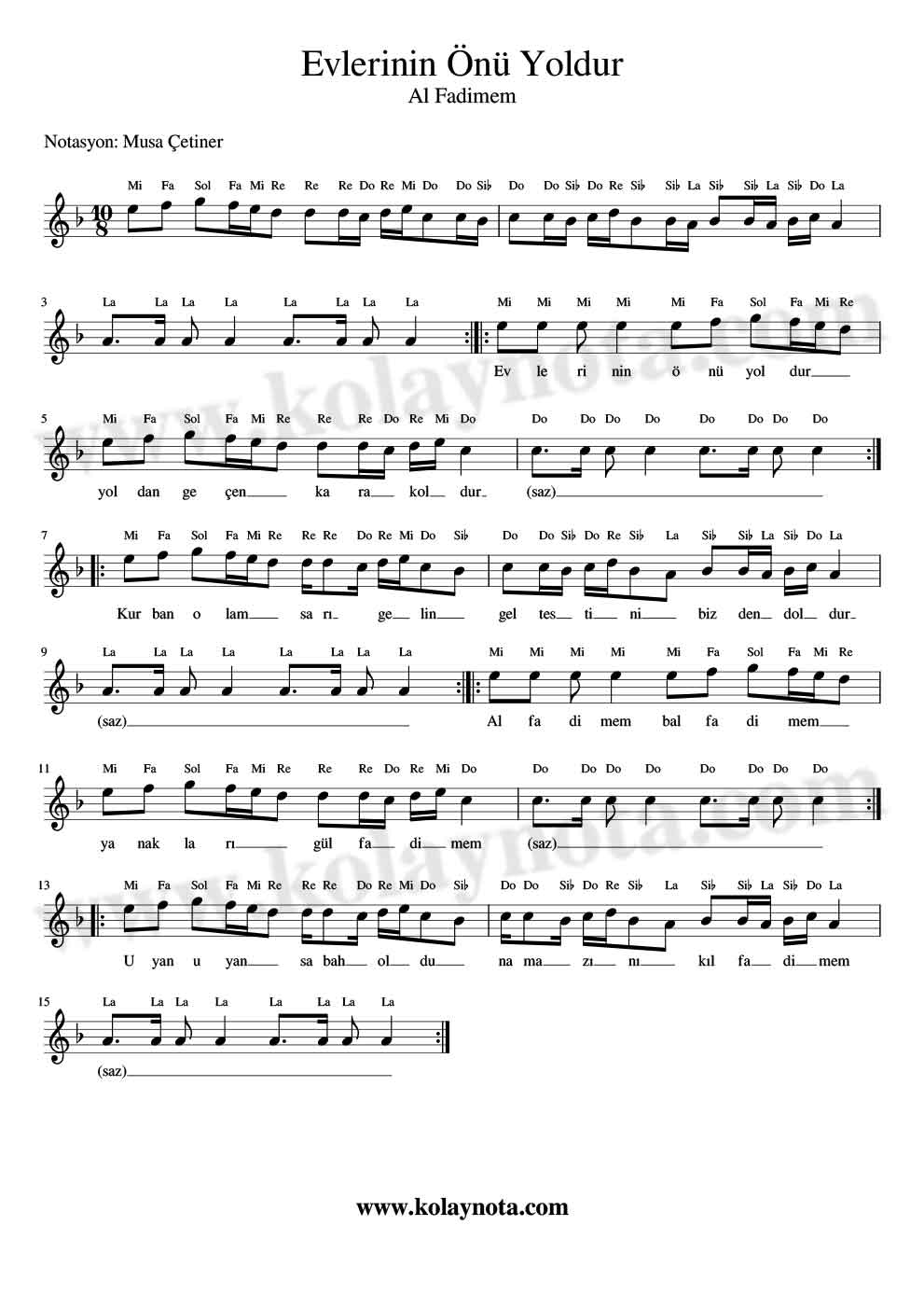 Al Fadimem veya diğer adıyla Evlerinin Önü Yoldur; Afyon Emirdağ yöresine ait bir türkü. Melodi kürdi dizisi üzerine kurulu ve 10/8 ölçü birimine sahip. Do Re Mi ve kolay notalarını paylaşacağım. Do Re Mi notasyonu mi karar, kolay notalarını la karar yazdım. Al Fadimem türküsünü keman, melodika, flüt, bağlama, org çalgılarında çalabilirsiniz. Başarılar.