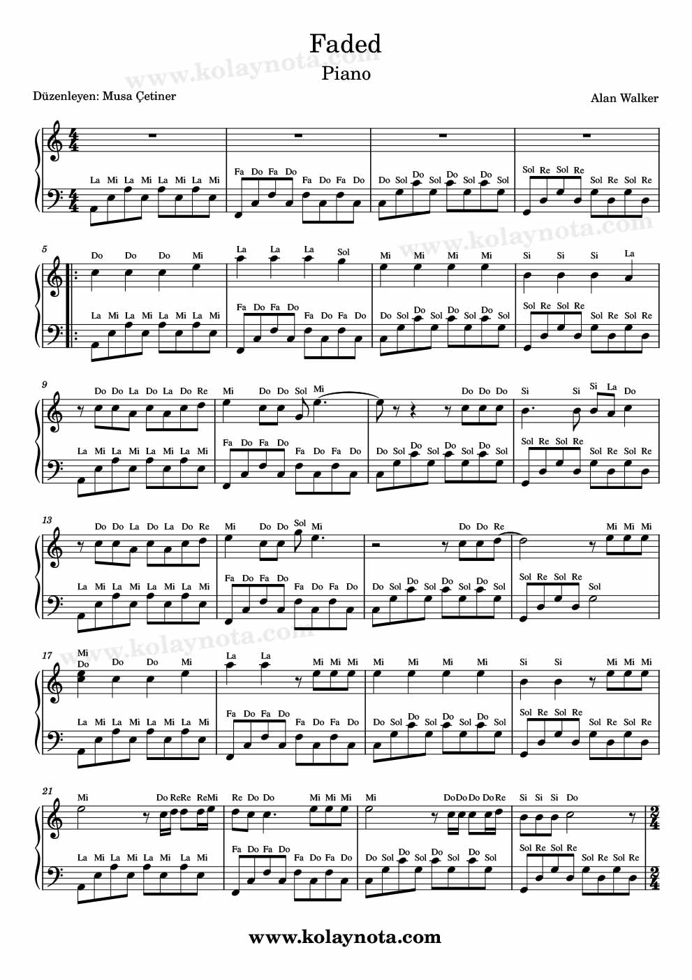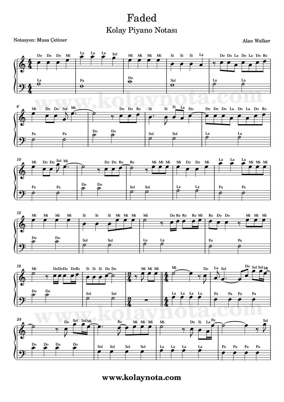Faded Kolay Piyano Notaları