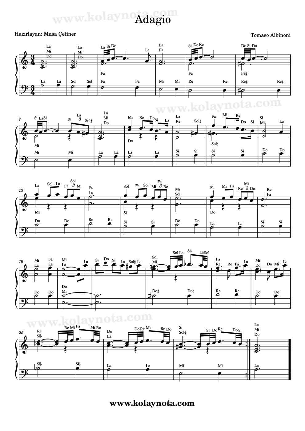Adagio; İtalyan besteci Tomaso Albinoni’nin bir eseri. Çok bilinen bir melodi. Orjinal tonu Sol minör, ben La minör tonunda bir düzenleme hazırladım. Şarkının karakterinden ödün vermeden kolaylaştırmaya çalıştım. Sol elde genellikle tek sesli bir eşlik var. Sağ melodiye eşlik eden notalar da göreceksiniz. Piyano çalmaya yeni başladıysanız bu durum biraz zorlayabilir.