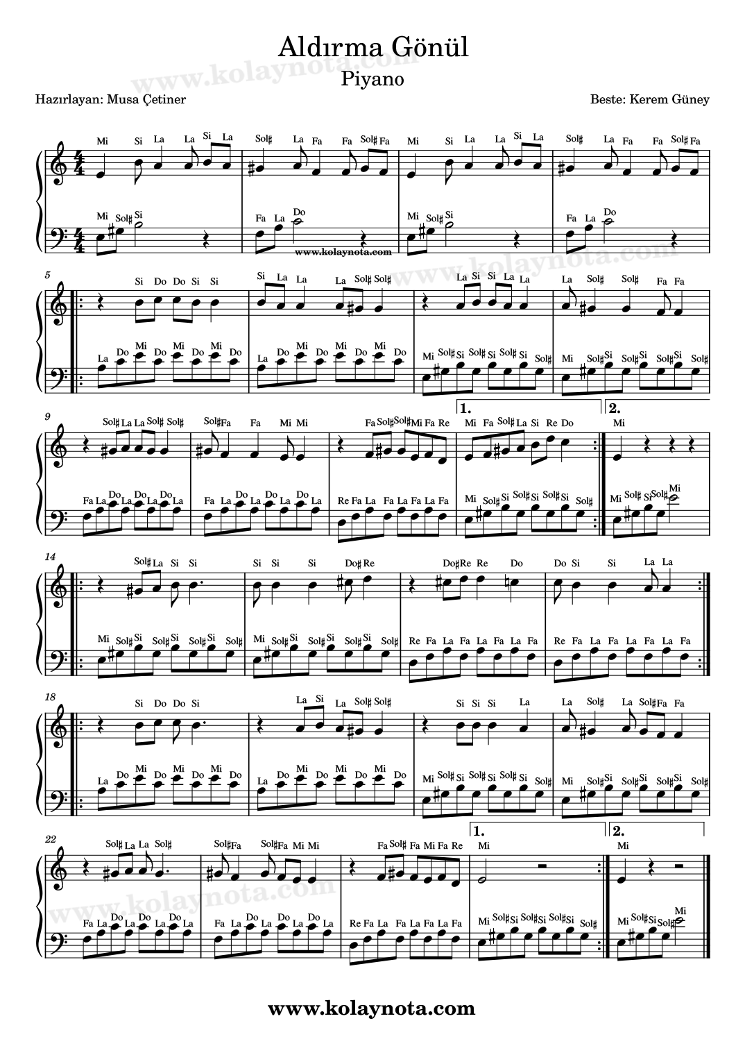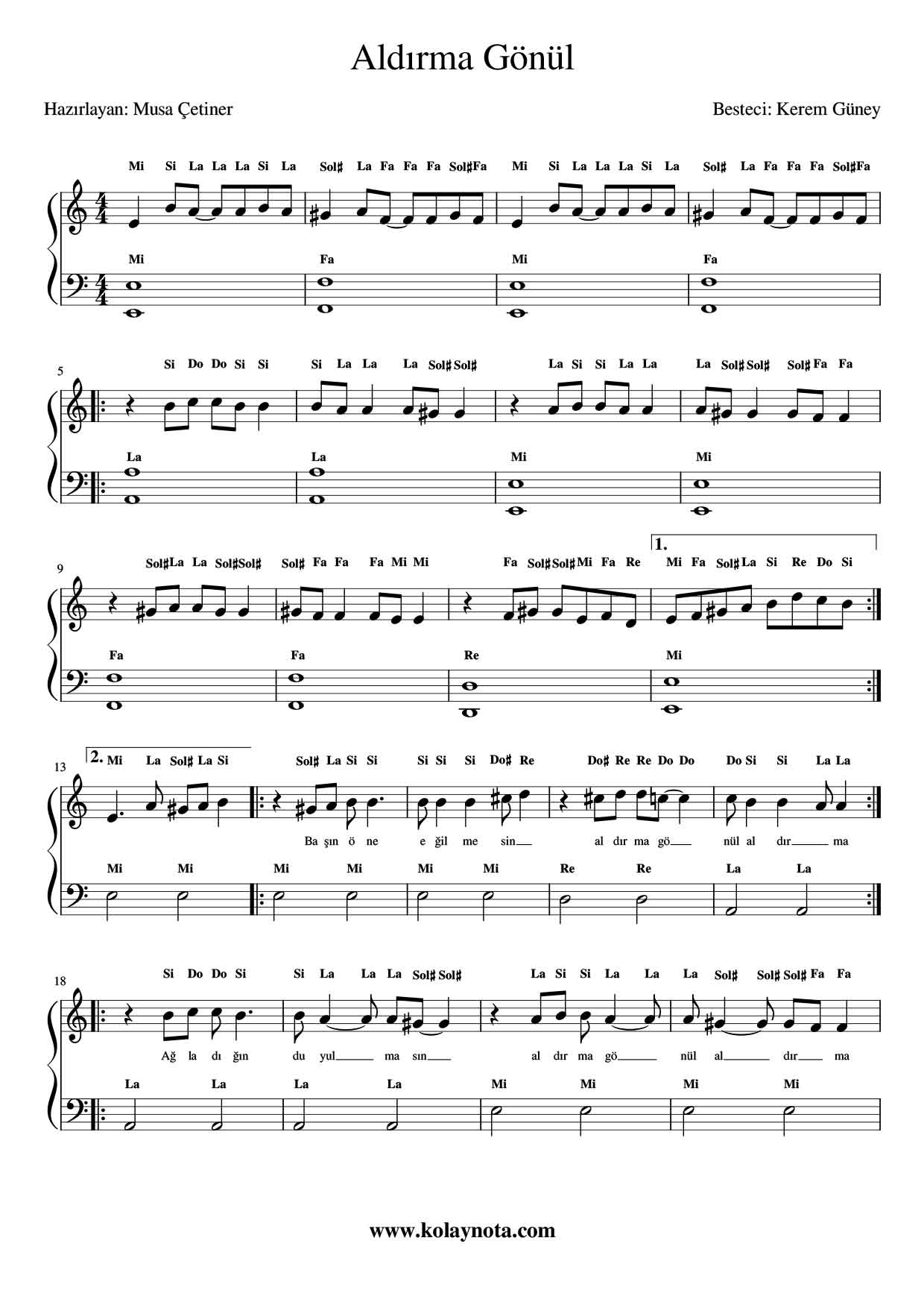 Aldırma Gönül hepimizin Edip Akbayram’ın yorumuyla bildiğimiz güzel bir şarkı. Kolay piyano biçiminde düzenledim. Sol basitçe çalabileceğiniz tek sesli bir eşlik var. Videosunu da ekleyeceğim, çalınışı hakkında bir fikir verecektir size. Pdf ve jpg olarak görüntüleyebilirsiniz. Başarılar.
