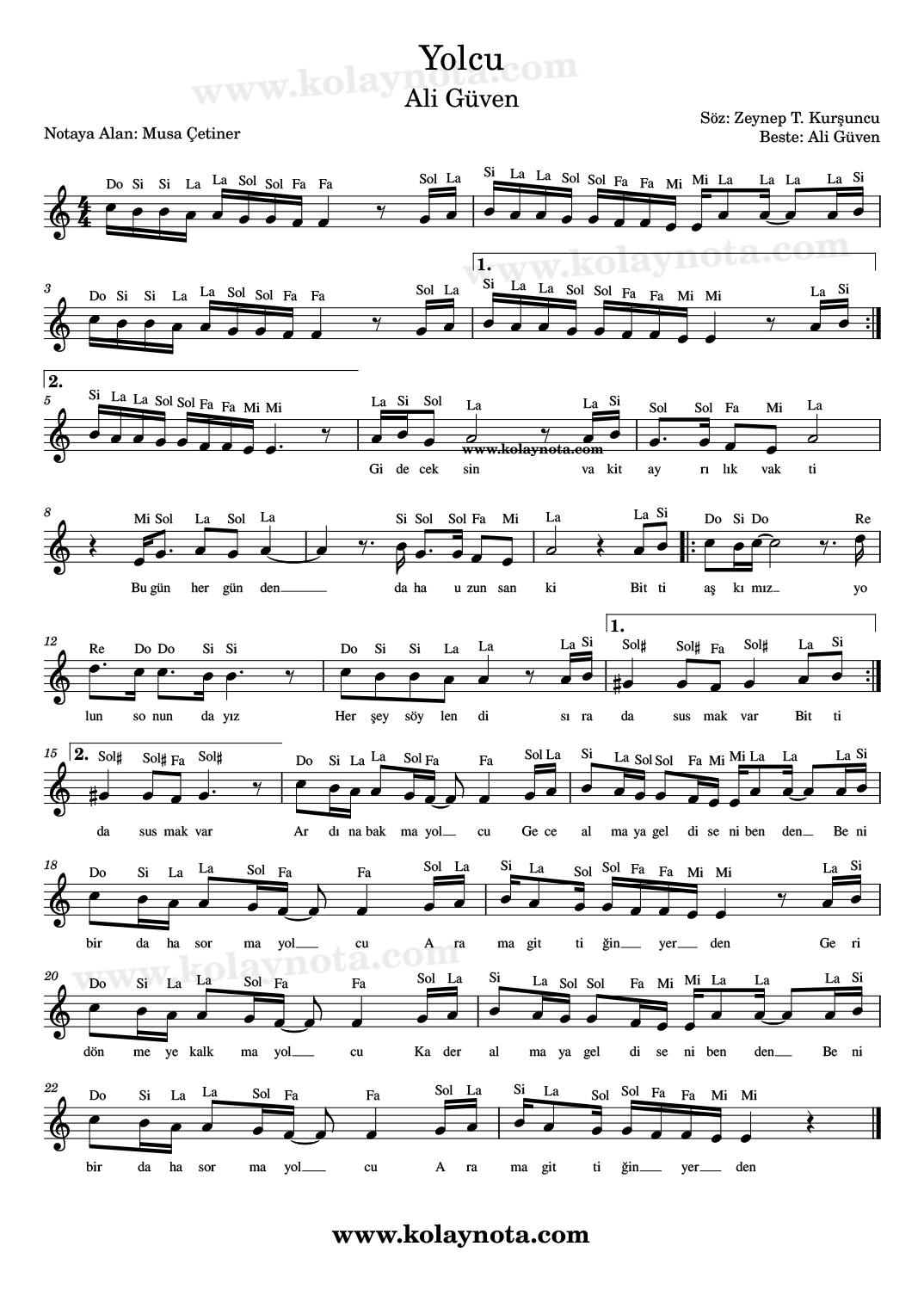Yolcu, Nota. Ali Güven’in bir şarkısı. Bestesi kendisine sözleri Zeynep Kurşuncu’ya ait. Şarkı, sanatçının 1997 yılında çıkan aynı adlı albümünde yer almış. Nihavend makamında bestelenmiş, Do# karar sesinde yorumlanmış. Ben La karar sesinde notaya aldım.