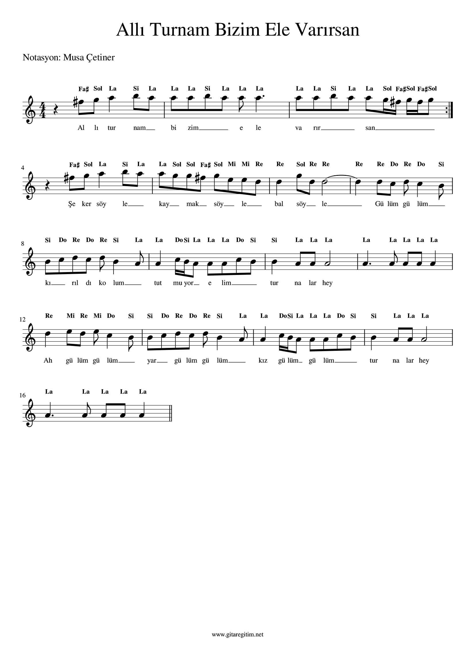 Allı Turnam Bizim Ele Varırsan – Kolay Nota by Musa Çetiner