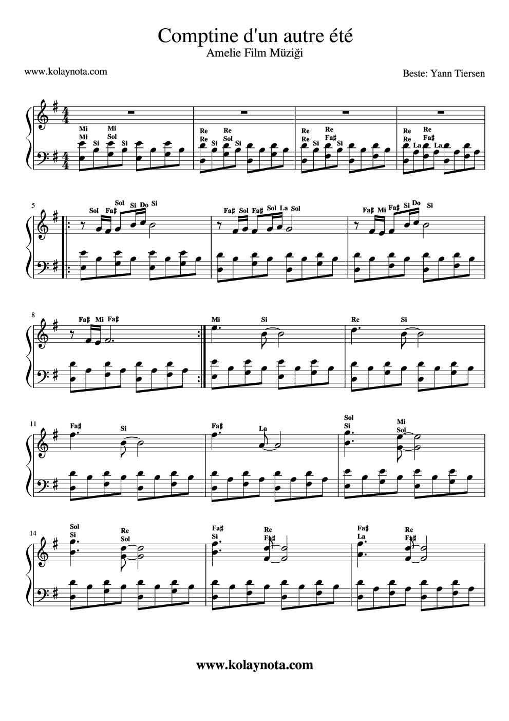 Amelie Piyano Notası » Piyano severlerin çok sevdiği bir şarkı. Şarkının asıl adı “Comptine d’un autre été“. Eserin bestecisi Yann Tiersen. Şarkı Mi minör tonunda, yani bütün Fa notaları Fa# olarak çalınacak. Jpg görsellerini aşağıya ekliyorum, nota isimleri her zamanki gibi üstlerinde yazıyor.