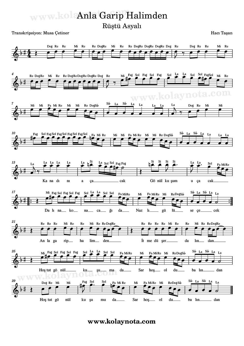 Anla Garip Halimden; Rüştü Asyalı’nın 1974 tarihli “Keloğlan ile Cankız” filminde seslendirdiği bir türkü. Melodisi Hacı Taşan’ın “Bugün Ayın Işığı” türküsü ile aynı, yeni sözler yazılmış film için. Hicaz Makamında bir türkü. La karar sesinde Do Re Mi ve Kolay notasını hazırladım. Do Re Mi notada sadece sözlü bölümler var.