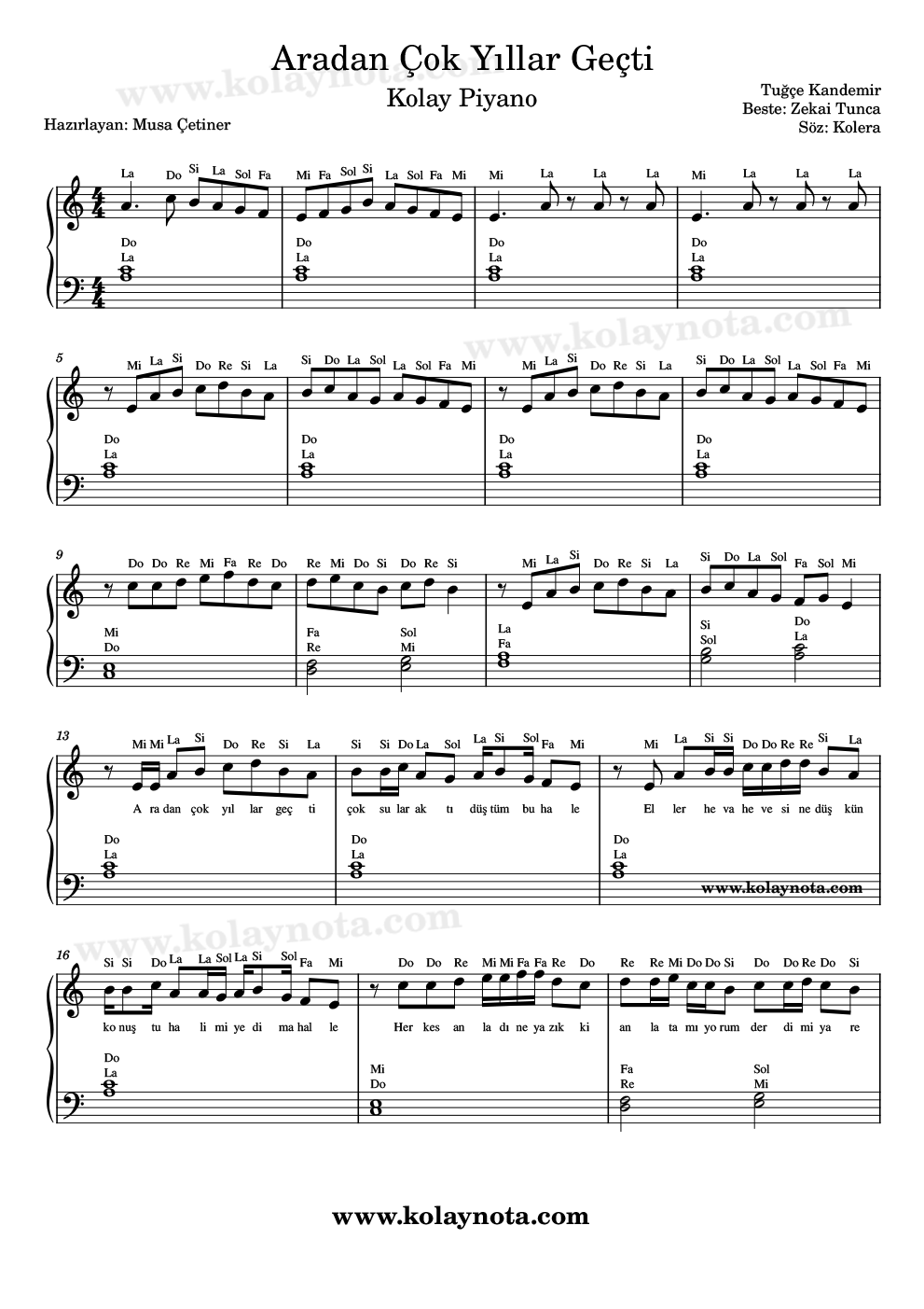 Aradan Çok Yıllar Geçti, Nota. Bestesi Zekai Tunca, sözleri Kolera’ya ait olan bir Tuğçe Kandemir şarkısı. Şarkının orjinal adı “Gülü Susuz Seni Aşksız Bırakmam“. Kürdi makamında bestelenmiş, Sol karar sesinde okunmuş. Ben La Karar sesinde kolay nota, Mi karar sesinde piyano notasını hazırladım. Keman, melodika, flüt, org, gibi çalgılarda çalabilir, notasyonu PDF ve imaj biçimlerinde görebilirsiniz.