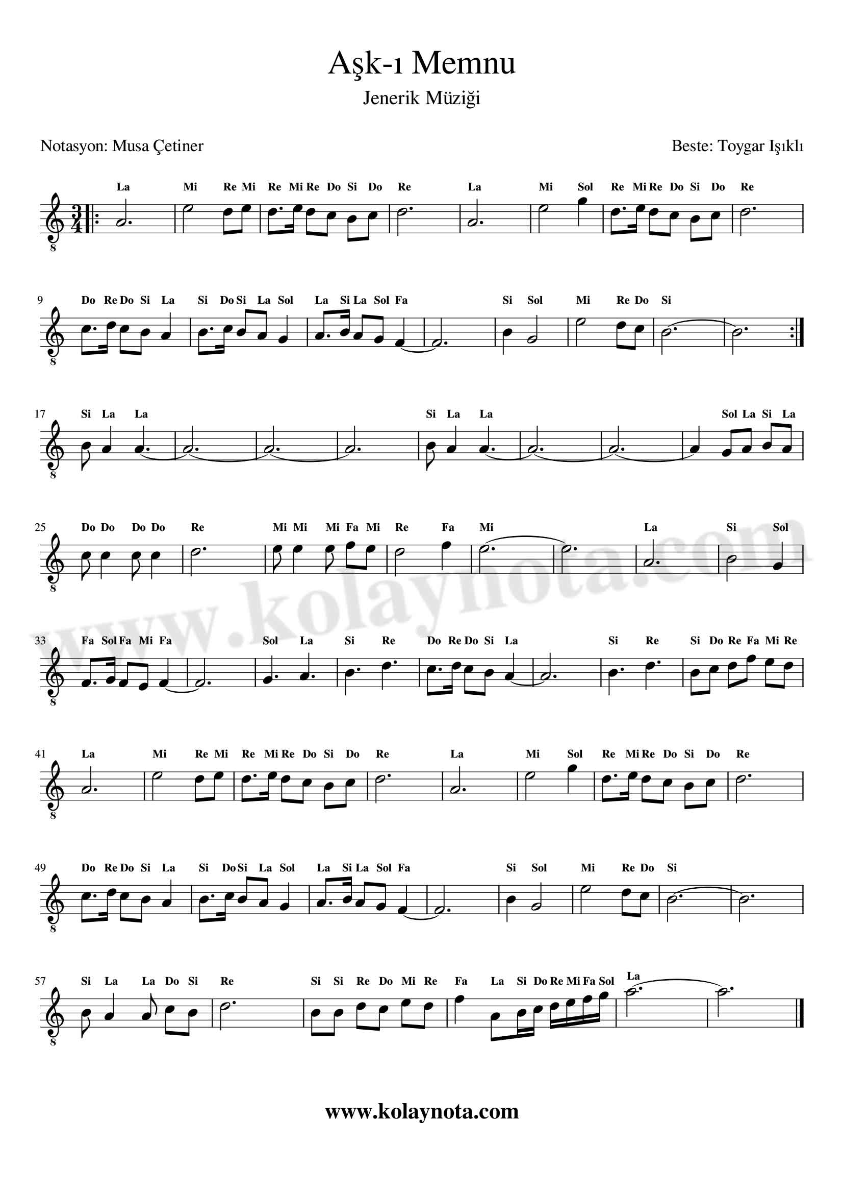 Aşk-ı Memnu dizisini herkes bilir, tekrarları bile reyting rekorları kırıyor. Haliyle jenerik müziğini de herkes biliyor. Şarkının bestecisi Toygar Işıklı. Solo melodi ve piyano notalarını paylaşacağım bu yazıda. Piyano notasının videosunu da ekliyorum. Şarkı aslında sol minör tonunda fakat ben la minör olarak notaya aldım. Piyano notası da la minör