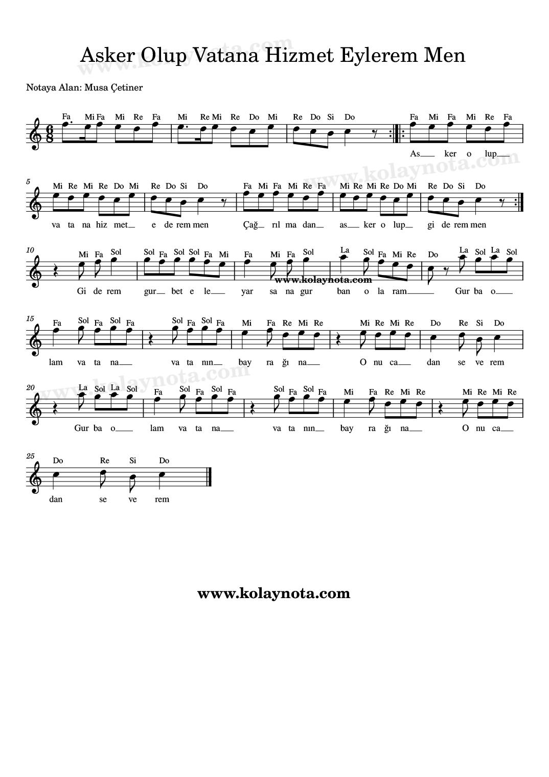 Asker Olup Vatana Hizmet Eylerem Men – Kolay Nota by Musa Çetiner