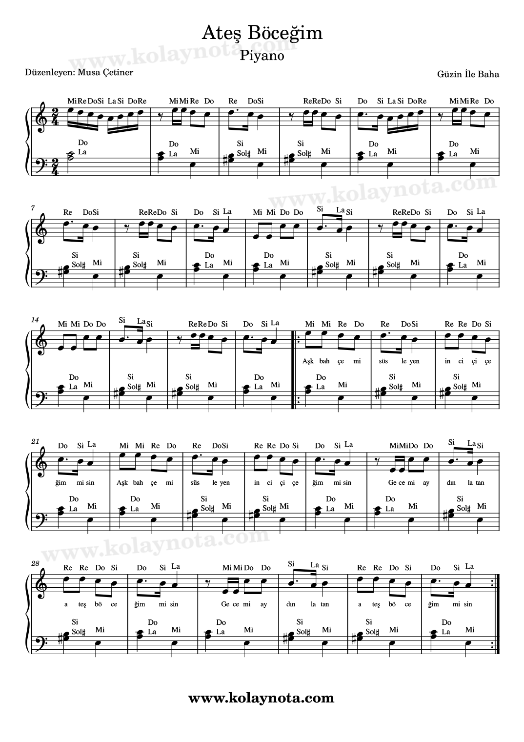 Ateş Böceğim misin? Sözleri Aysel Gürel’e ait bir Güzin İle Baha şarkısı. Şarkıyı hepimiz biliyoruz, 2 versiyon paylaşacağım, bir tanesi la karar diğeri re karar yazıldı. Kolay notasını da en alta ekliyorum, kolay nota daha detaylı bir notasyon. Bu unutulmaz şarkının notalarını keman, melodika, flüt, org çalgılarında çalabilirsiniz. Başarılar.