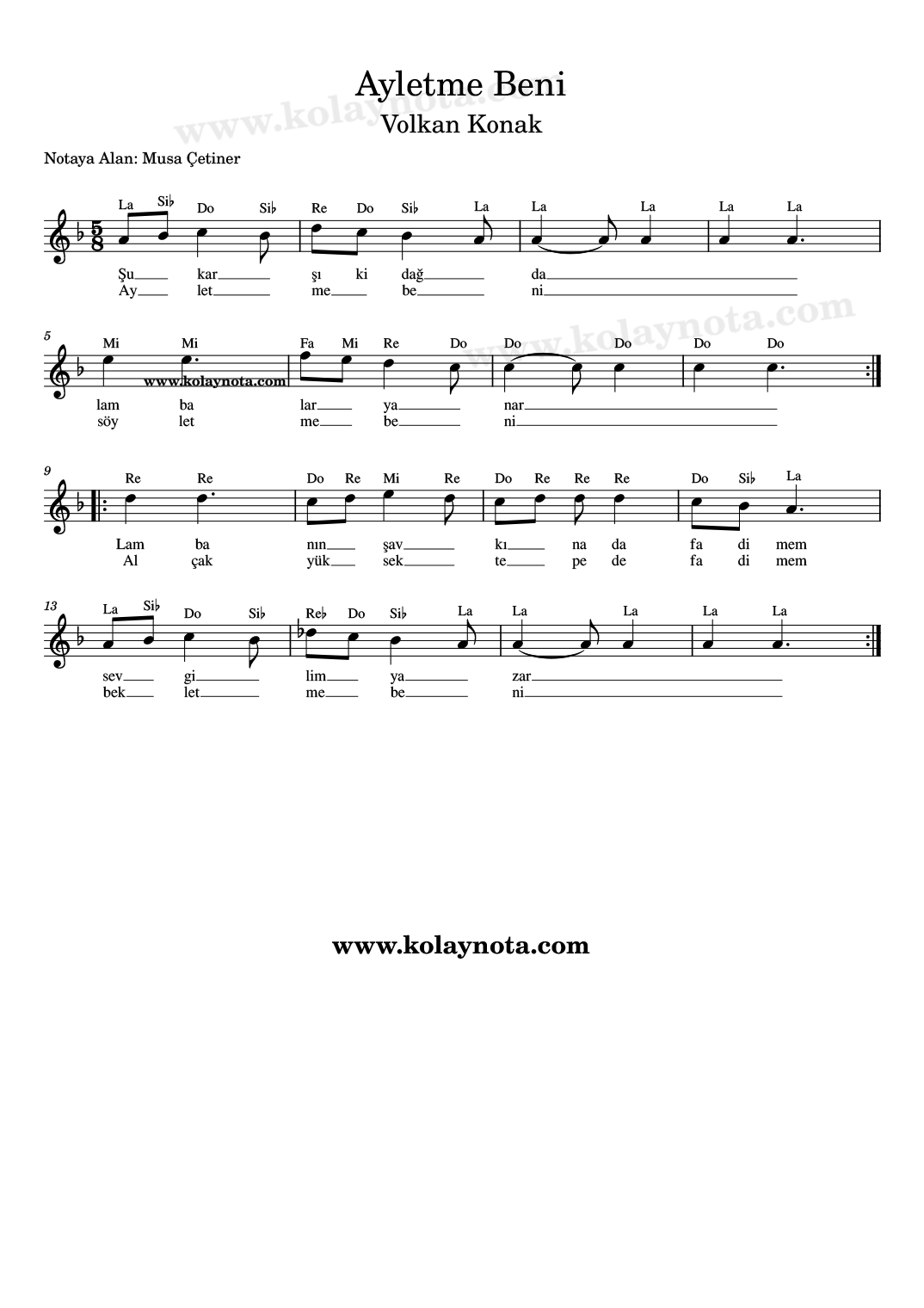 Ayletme Beni, Nota. Volkan Konak’ın sesinden tanıdığımız bir türkü. La Karar sesinde kolay nota ve Mi karar sesinde Do Re Mi notasını görebilirsiniz. Keman, melodika, flüt, bağlama, org, piyano gibi çalgılarda çalabilir, PDF ve imaj biçiminde görüntüleyebilirsiniz.