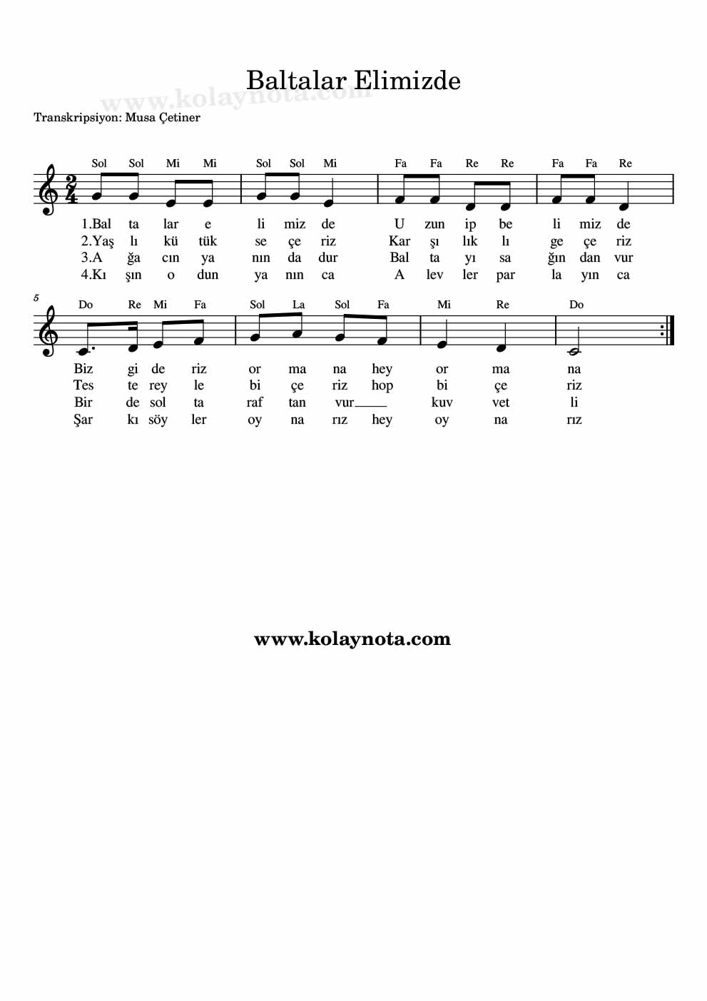 Baltalar Elimizde, Nota. Anonim bir çocuk şarkısı. Do majör tonunda notaya aldım. Do Re Mi ve Kolay Notasyonunu görebilir, keman, melodika, flüt, org, piyano gibi çalgılarda çalabilirsiniz.