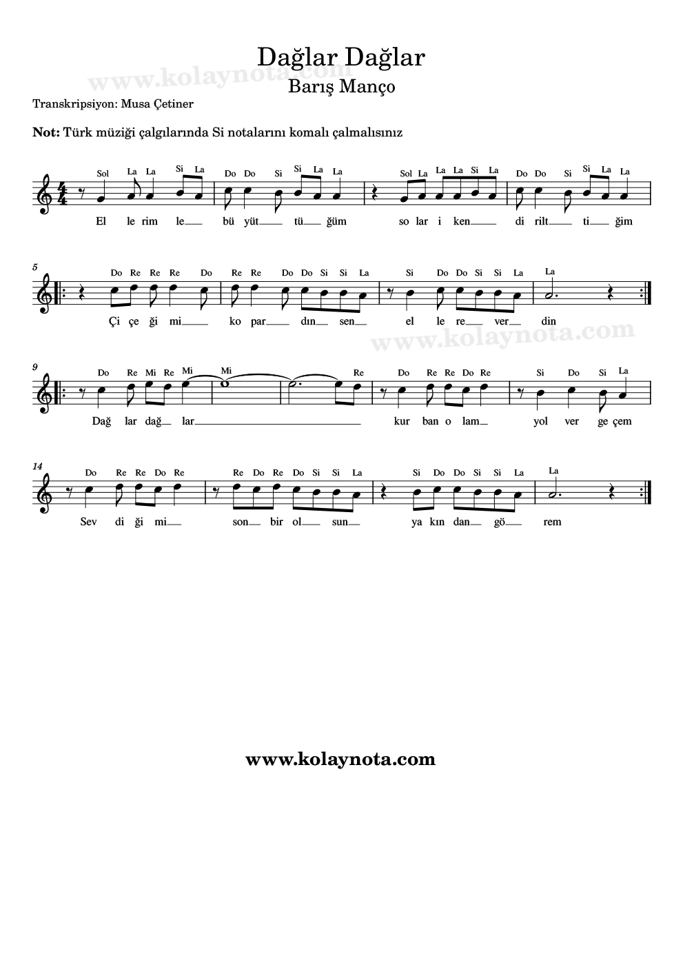 Dağlar Dağlar, Nota. Barış Manço’nun çok sevilen bir şarkısı. Sanatçının 1970 yılında çıkan 45’lik plağında yer almış. Uşşak makamında bir şarkı, La karar sesinde notaya aldım. Türk müziği çalgılarında çalıyorsanız Si notalarını komalı çalmalısınız. Notasyonu PDF ve imaj formatında görebilir, keman, bağlama, melodika, flüt, org gibi çalgılarda çalabilirsiniz.