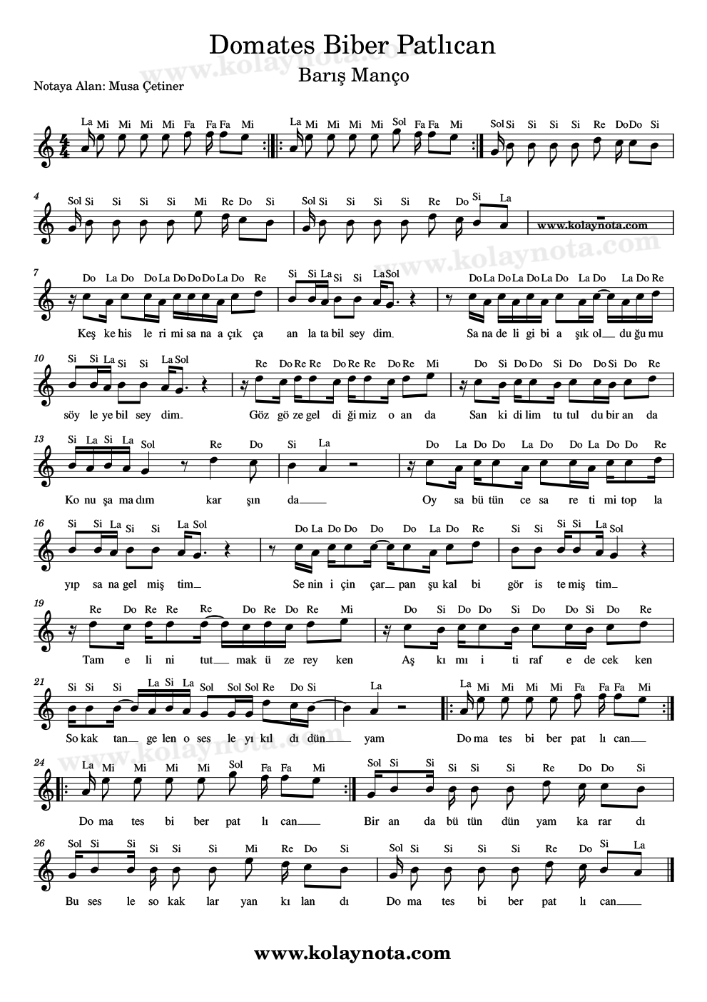 Domates Biber Patlıcan, Nota. Barış Manço’nun şarkısı. Sözü ve müziği kendisine ait. Sol minör tonunda yorumlanmış, ben La minör tonunda notaya aldım. Kolay notasını keman, melodika, flüt, org, piyano gibi çalgılarda çalabilirsiniz.