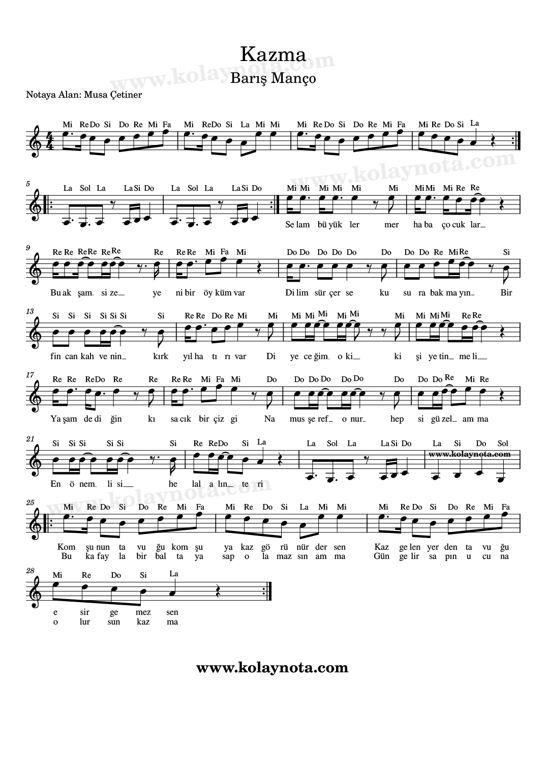 Sol karar sesinde yorumlanmış, ben La karar sesinde notaya aldım. Keman, piyano, melodika, flüt, org gibi çalgılarda çalabilir, PDF ve imaj biçiminde görüntüleyebilirsiniz. Notayı dinleyerek çalışabilirsiniz.