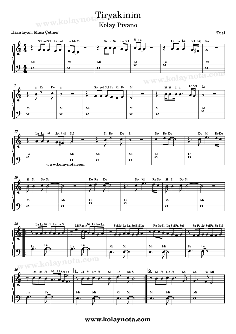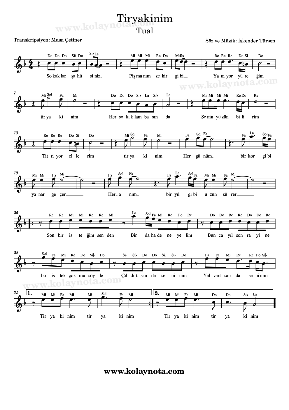Tiryakinim, Nota. Bayhan’ın yorumuyla tekrar popüler hale gelen, Tual grubunun bir şarkısı. Kürdi dizisi üzerine bestelenmiş. Bayhan şarkıyı Sol#, Tual grubu da Sol karar sesinde yorumlamış. Ben La karar sesinde kolay ve Mi karar sesinde piyano düzenlemesini hazırladım. Piyano, keman, melodika, flüt, org gibi çalgılarda çalabilir, PDF ve İmaj biçimlerinde görüntüleyebilirsiniz.