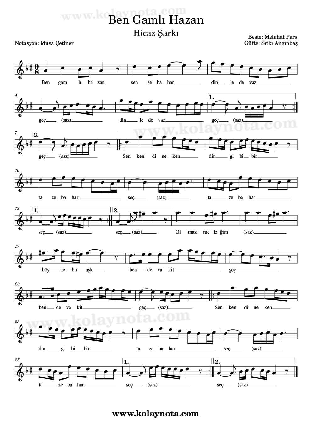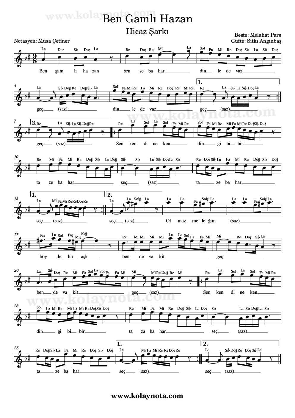 Ben Gamlı Hazan – Kolay Nota by Musa Çetiner