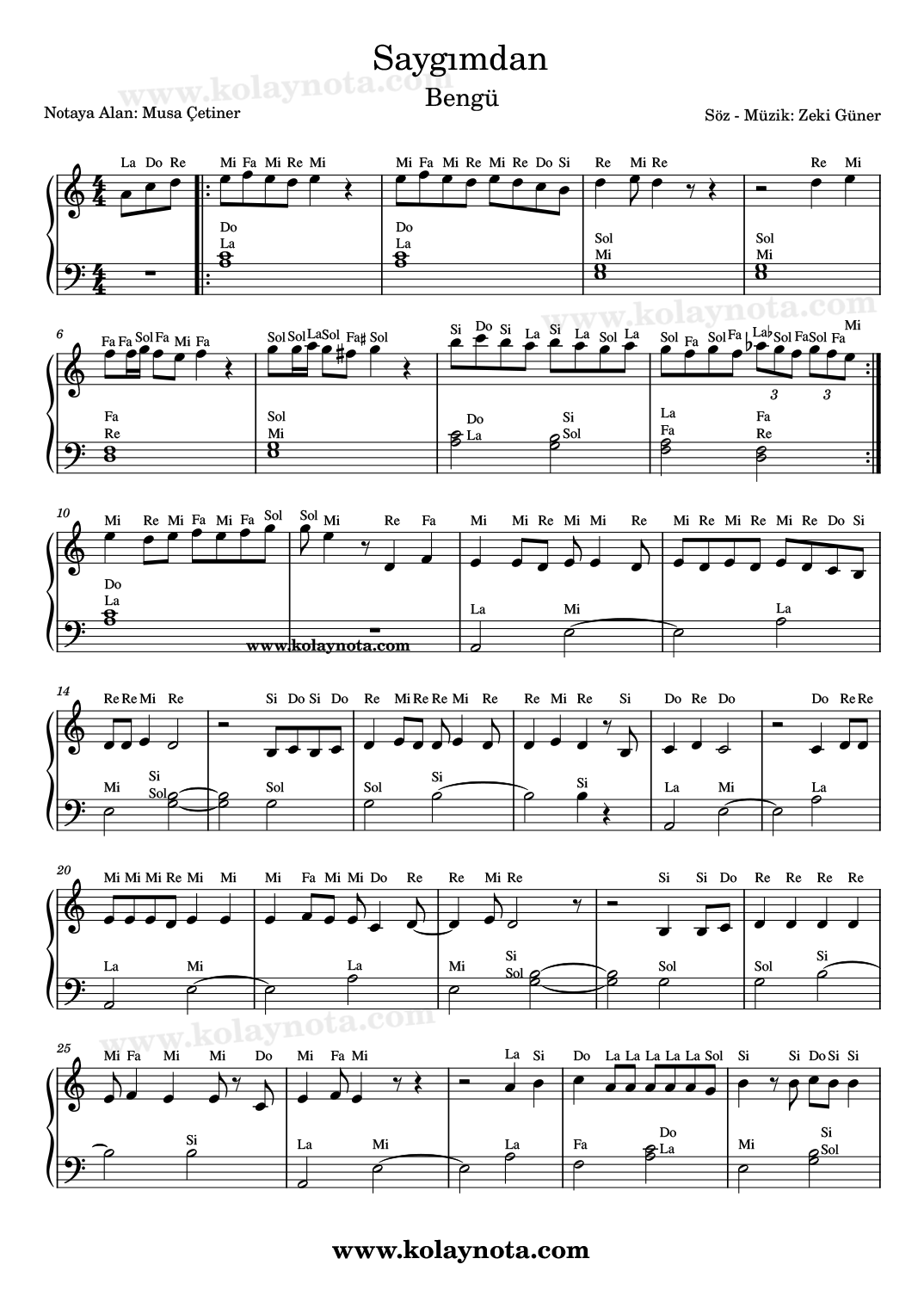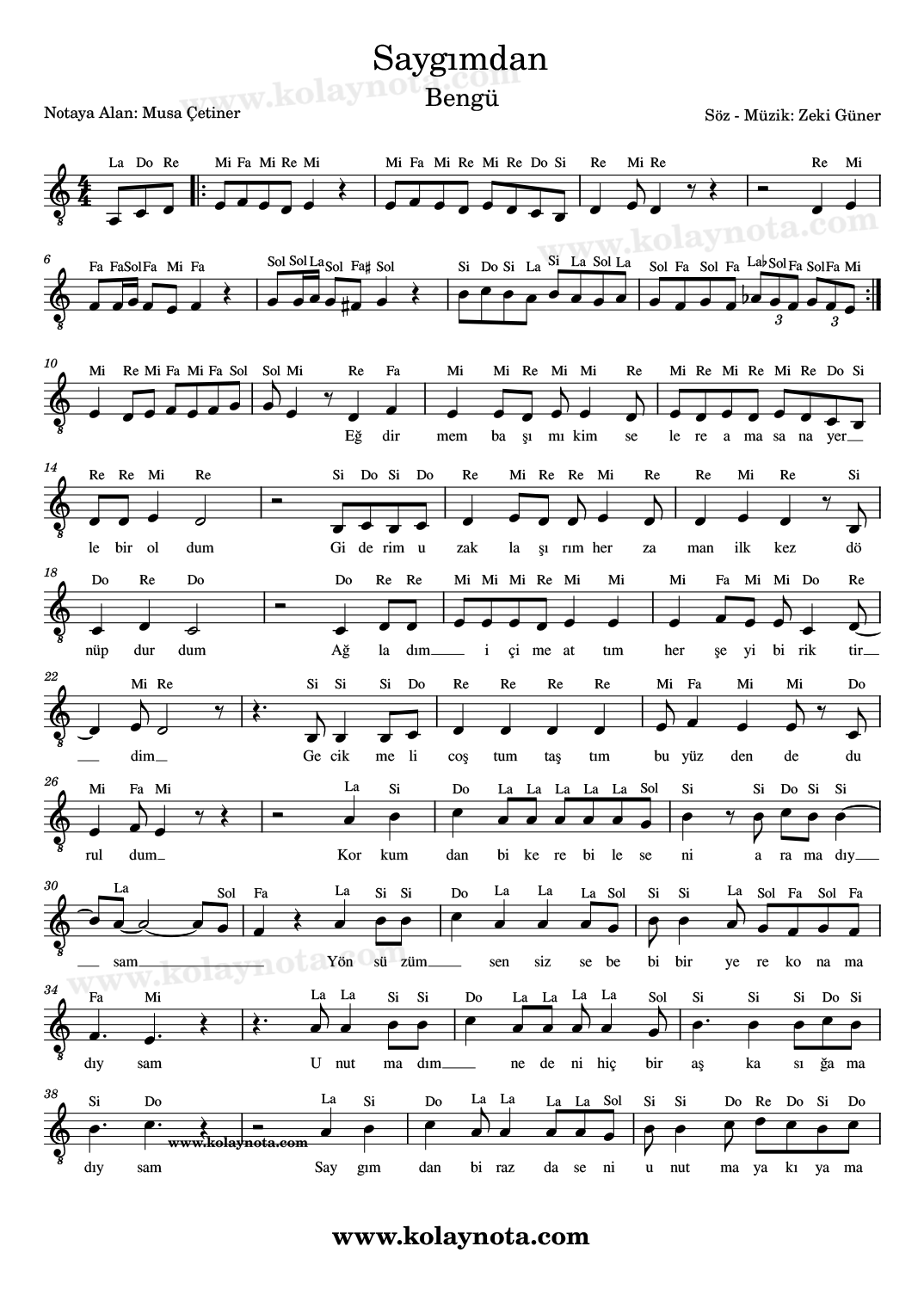 Saygımdan, Nota. Sözü ve müziği Zeki Güner’e ait olan bir Bengü şarkısı. Kolay notasını görebilirsiniz bu yazıda. Fa karar sesinde söylenmiş, ben La karar sesinde notaya aldım. PDF ve imaj biçiminde görebilir, keman, piyano, melodika, flüt, org gibi çalgılarda çalabilirsiniz.