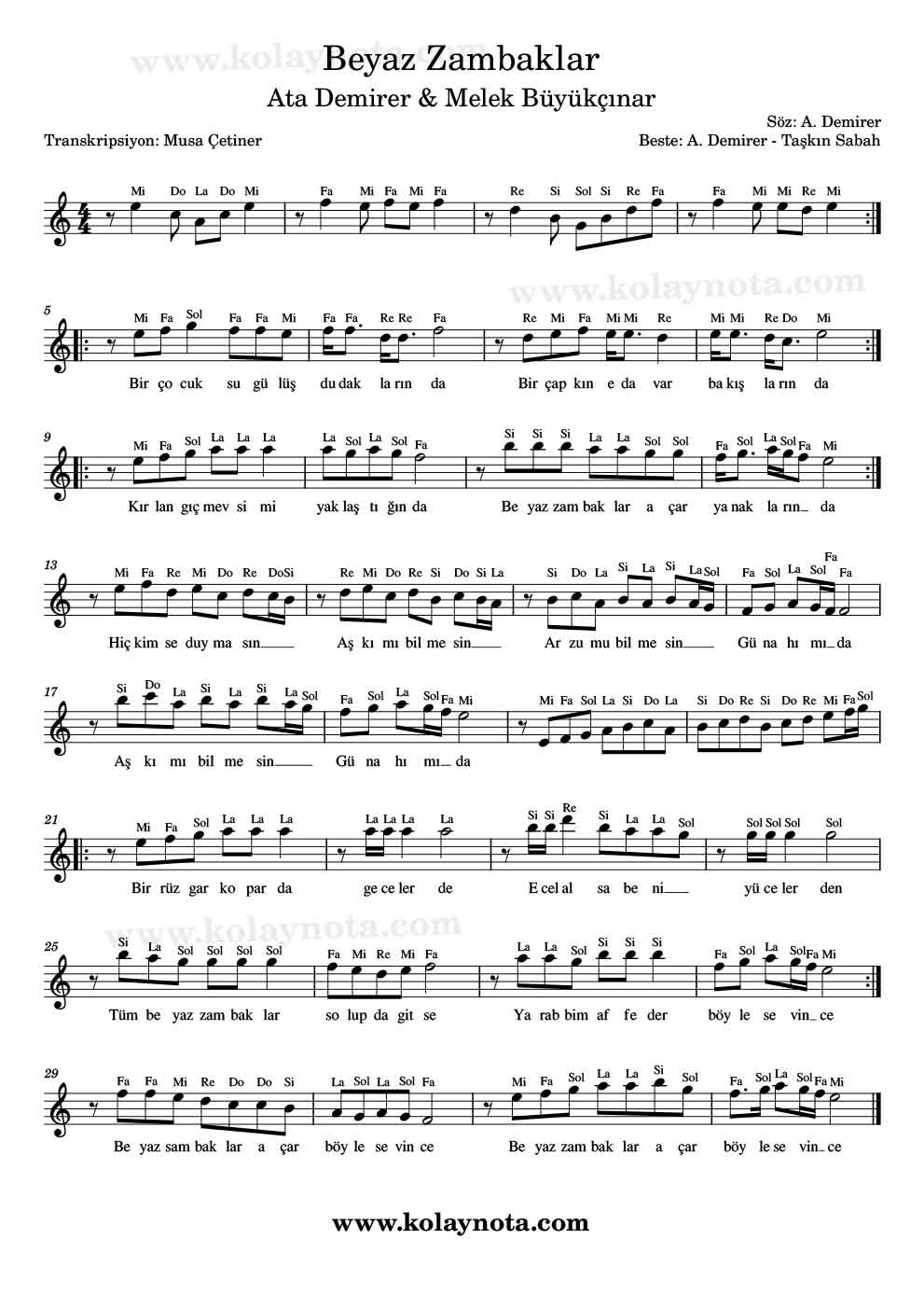 Beyaz Zambaklar – Nota