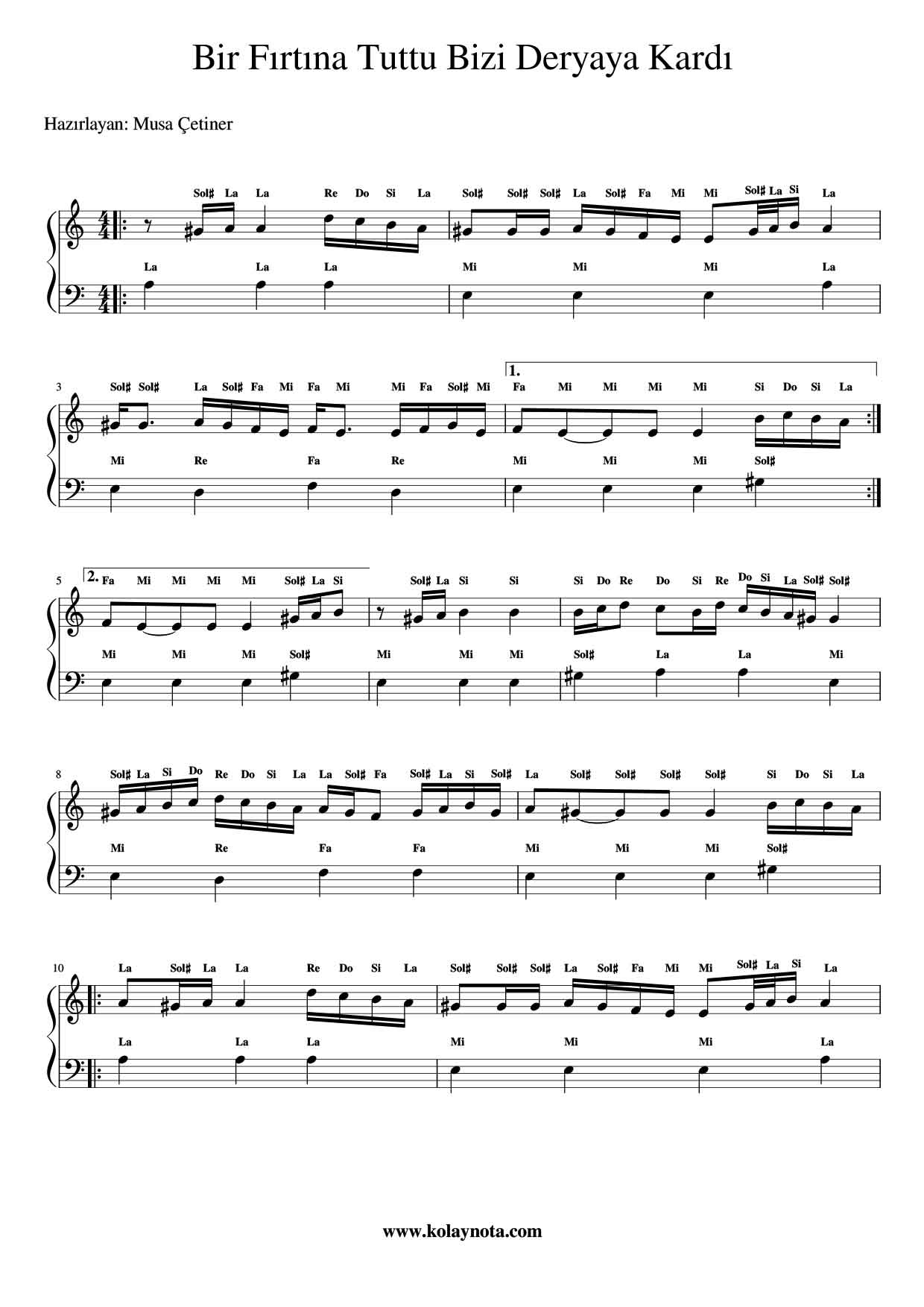 Bir Fırtına Tuttu Bizi – Kolay Piyano Notası