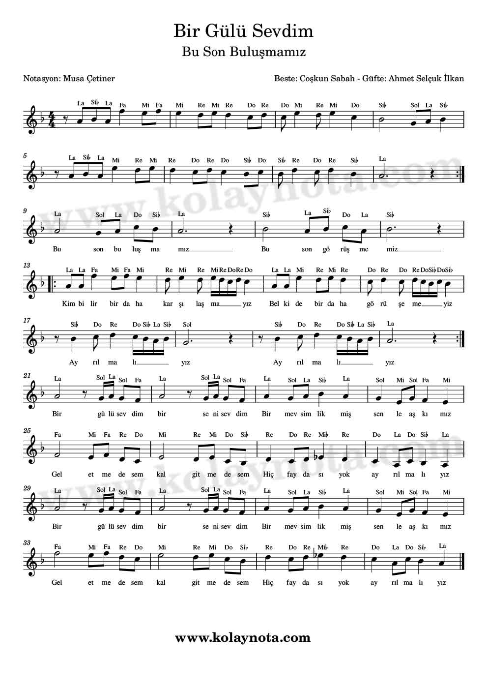 Bir Gülü Sevdim; Muhayyerkürdi makamında, bestesi Cokun Sabah, sözleri ise Ahmet Selçuk İlkan’a ait olan bir şarkı. Bu şarkıyı günümüze kadar birçok sanatçı seslendirdi. Bu yazıdaki notasyon Zerrin Özer yorumuna daha yakın. Do Re mi melodika notalarını mi karar, kolay notasını ise la karar paylaşacağım. Bu güzel şarkıyı keman, melodika, flüt, org gibi çalgılarda çalabilirsiniz. Başarılar.