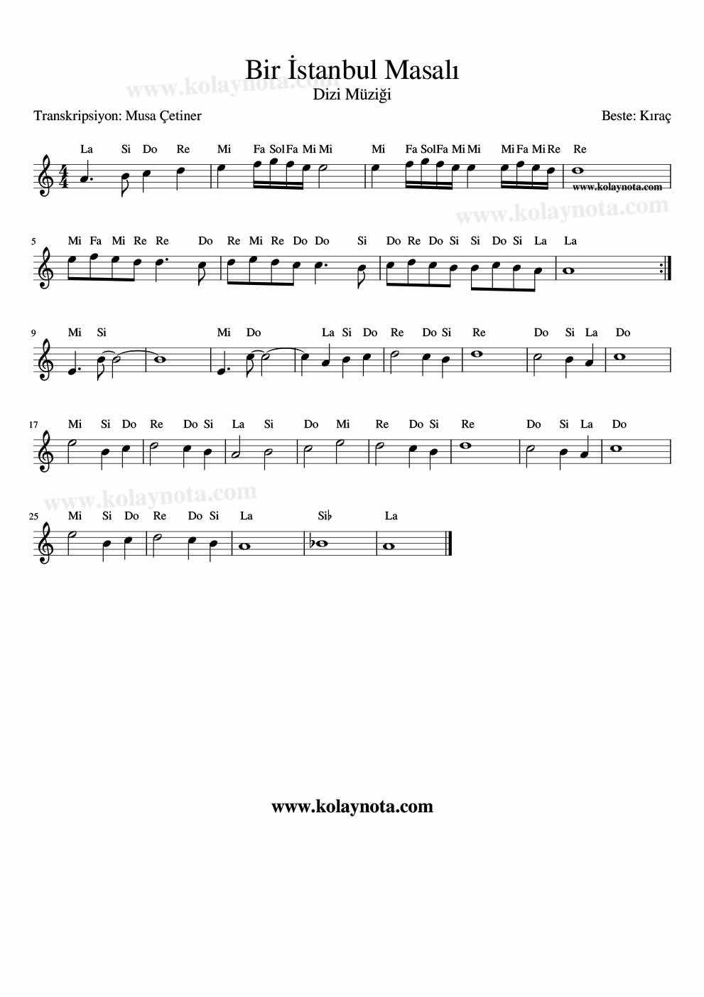 Bir İstanbul Masalı, Nota. Aynı isimli dizinin müziği. Bestesi Kıraç’a ait. Minör tonda bir şarkı, ben La minör tonunda notaya aldım. Akılda kalıcı bir melodi, sözlü versiyonu da var, buradaki enstrümantal hali. Sözlü halinde de melodi aynı kalıyor.