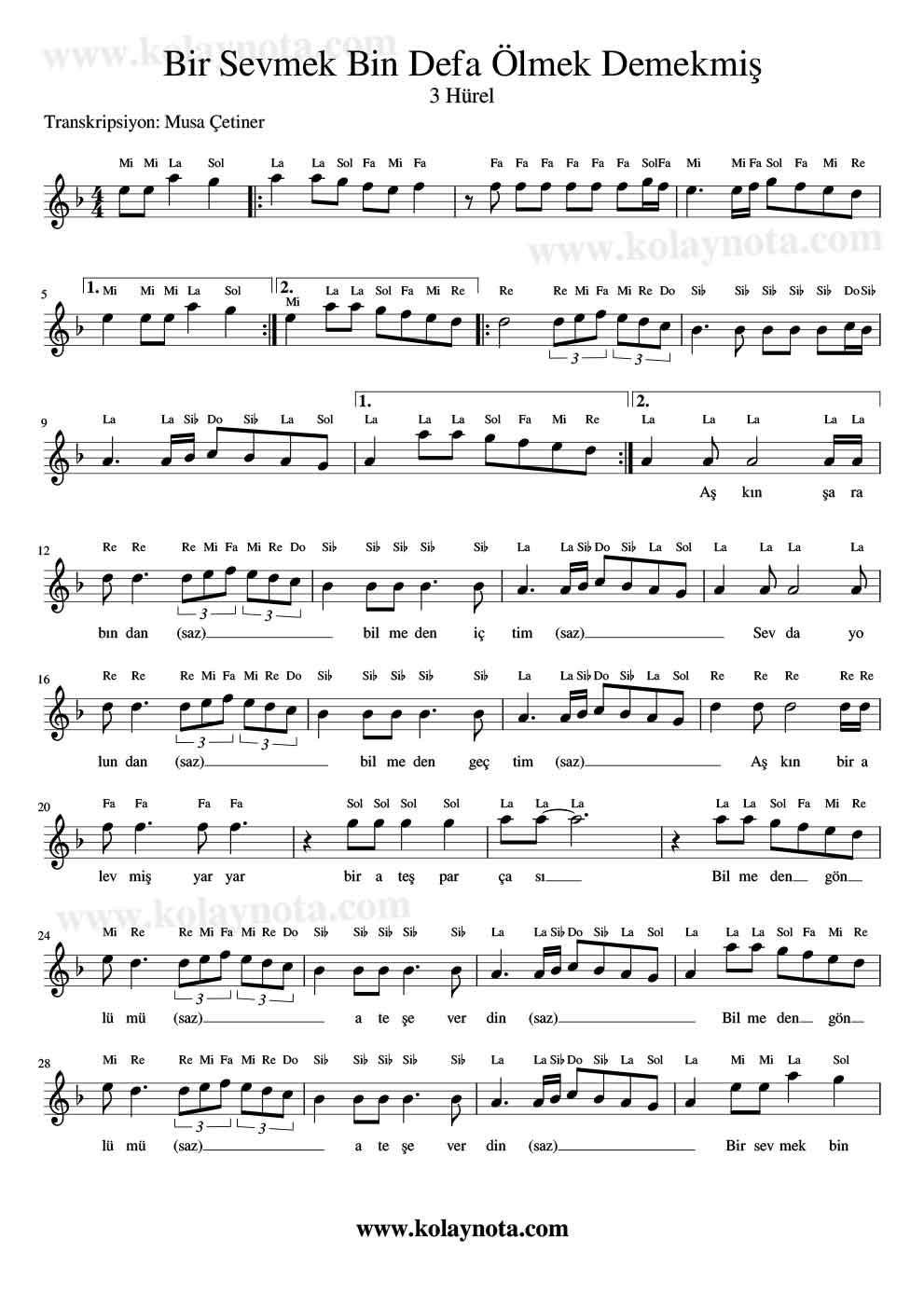Bir Sevmek Bin Defa Ölmek Demekmiş – Nota