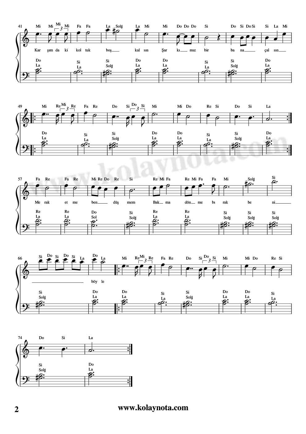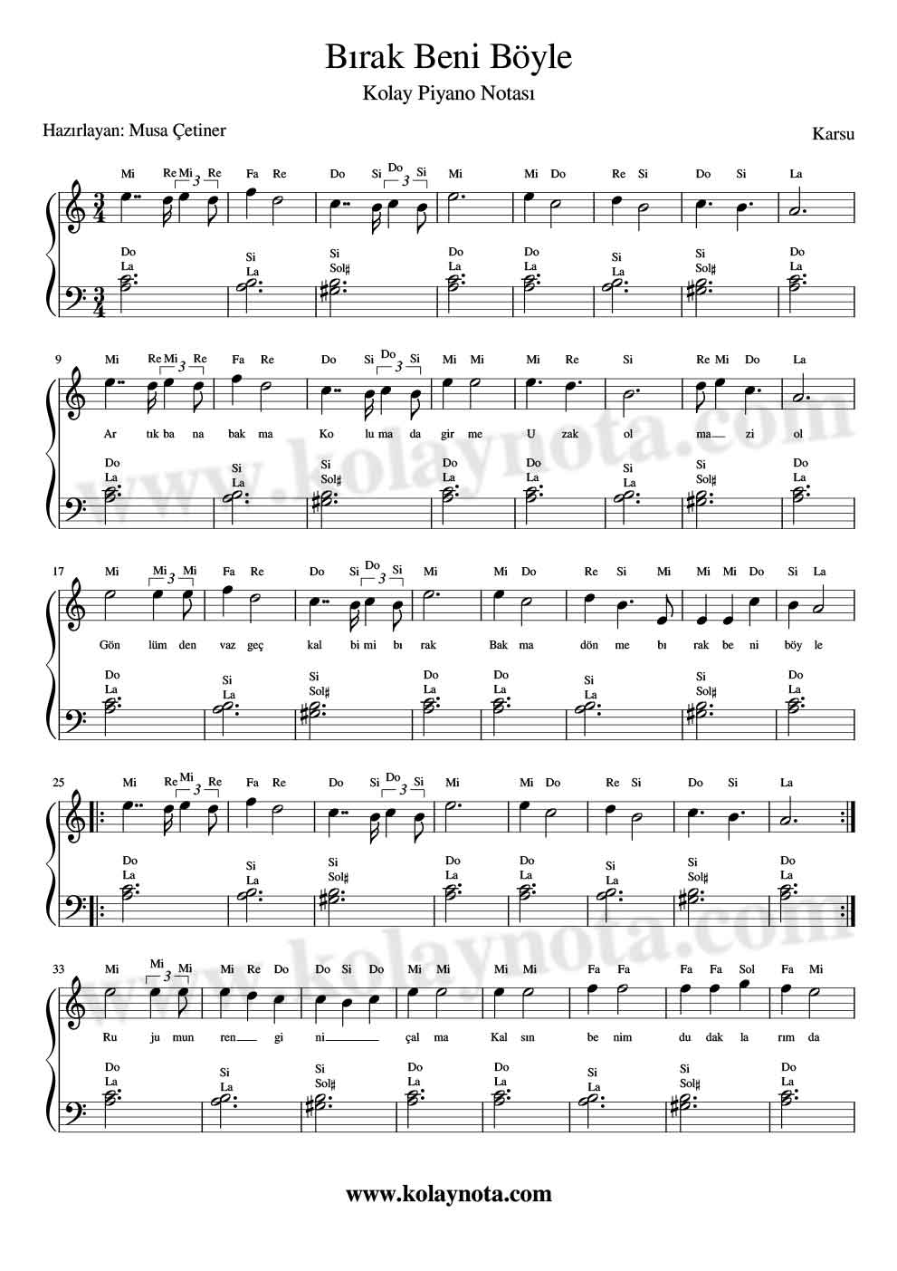 Bırak Beni Böyle; Karsu’nun çok sevilen bir şarkısı. Kolay notasını ve akorlu kolay piyano düzenlemesini paylaşacağım. Piyano düzenlemesini La minör tonunda hazırladım. Kolay notası ise şarkının orjinal tonunda yani si minör tonunda. Piyano düzenlemesinin videosunu da ekleyeceğim, düzenleme hakkında bir fikir verecektir size. Başarılar.