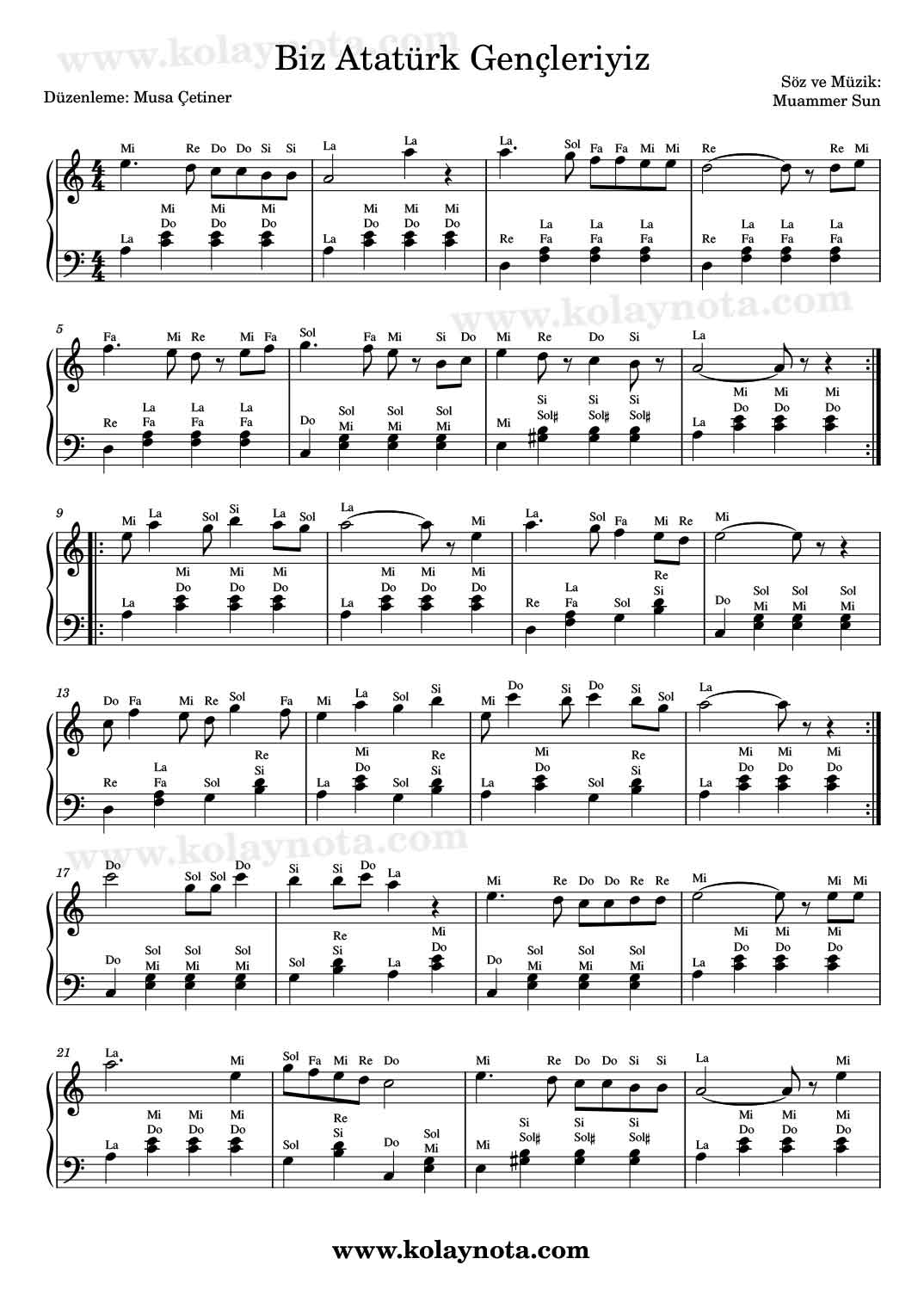 Biz Atatürk Gençleriyiz; sözleri ve müziği müzik eğitimcisi ve besteci Muammer Sun’a ait bir şarkı. Muammer Sun’un 2020 yılında çıkan “Nesilden Nesile Çocuk Şarkıları” albümünde yer almış fakat yıllardır korolar tarafından söylenen bir şarkı. Do Minör ve Re Minör tonunda kolay notasını hazırladım.