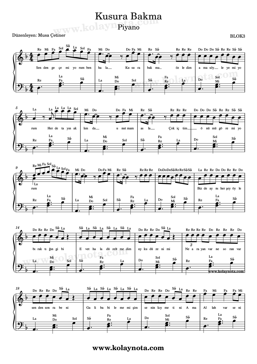 Kusura Bakma, Nota. BLOK3’ün bir şarkısı. Re karar sesinde yorumlanmış, aynı karar seste notaya aldım. Keman, piyano, melodika, flüt, org gibi çalgılarda çalabilir, PDF ve imaj biçiminde görüntüleyebilirsiniz.