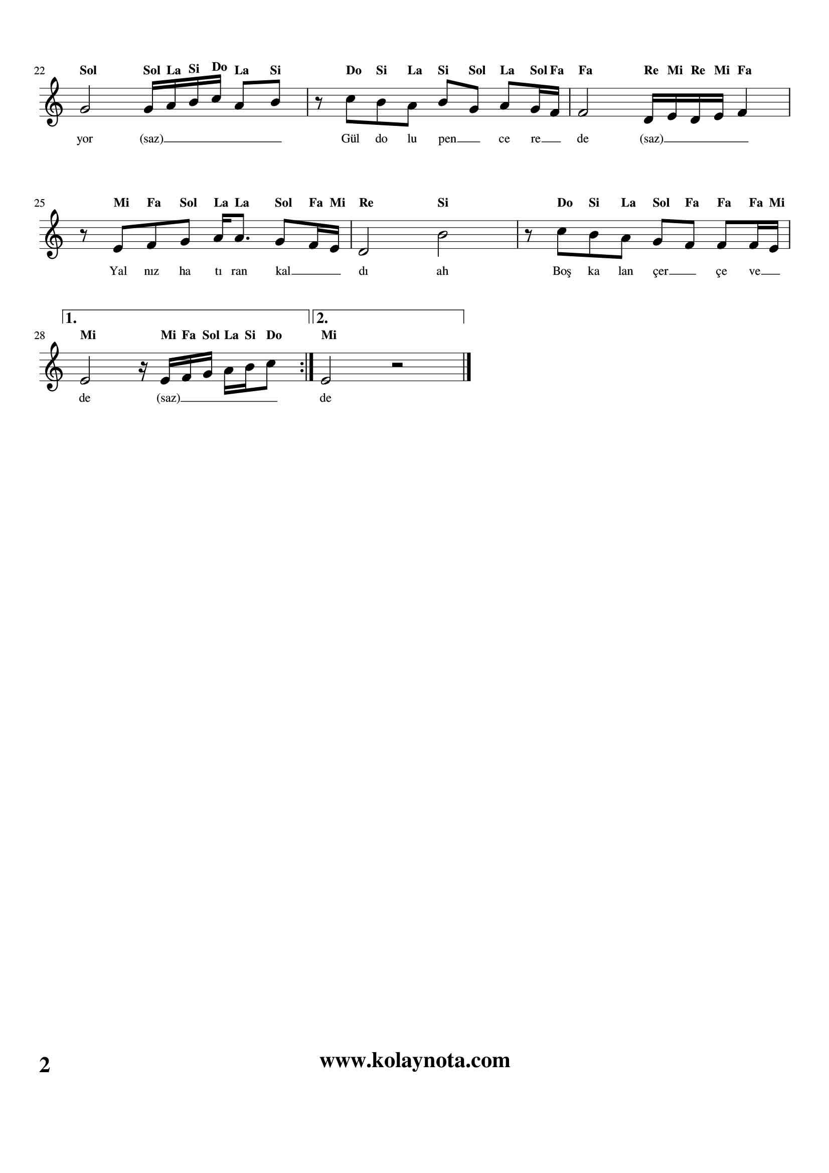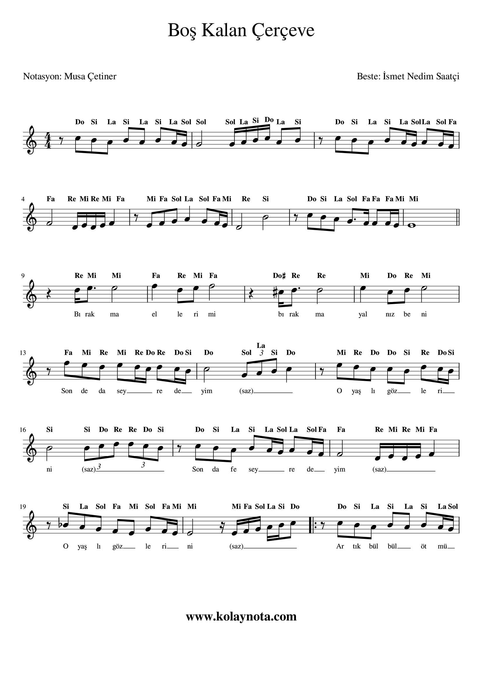 Melodika, keman, org, flüt notaları. Bestesi İsmet Nedim Saatçi, sözleri Şendoğan Atda’ya ait olan, muhayyerkürdi makamında bir şarkı. Kolay nota ve Do Re Mi notasyonunu paylaşacağım bu yazıda. 2 notasyonda mi karar sesinde yazıldı. Do Re Mi notası sadece sözlü bölümleri içeriyor, kolay notası biraz daha geniş bir versiyon. Sorularınızı yorumlara yazmayı ve siteye abone olmayı unutmayın. Teşekkürler.