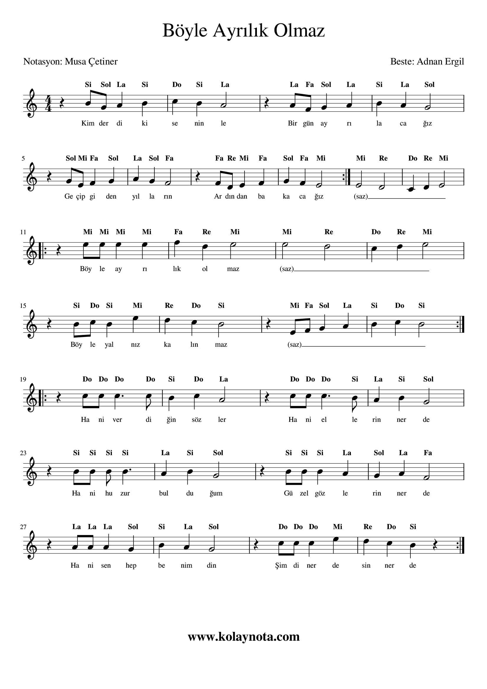 Böyle Ayrılık Olmaz; bestesi Adnan Ergil‘e ait bir Nilüfer şarkısı. Şarkı kürdi dizisi üzerine kurulu. Do Re Mi notaları ve Kolay notasını paylaşacağım. Notalarını Mi karar hazırladım.