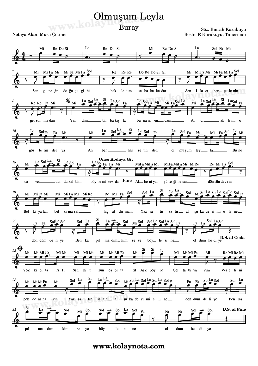 Olmusum Leyla – Buray – Kolay Nota by Musa Çetiner