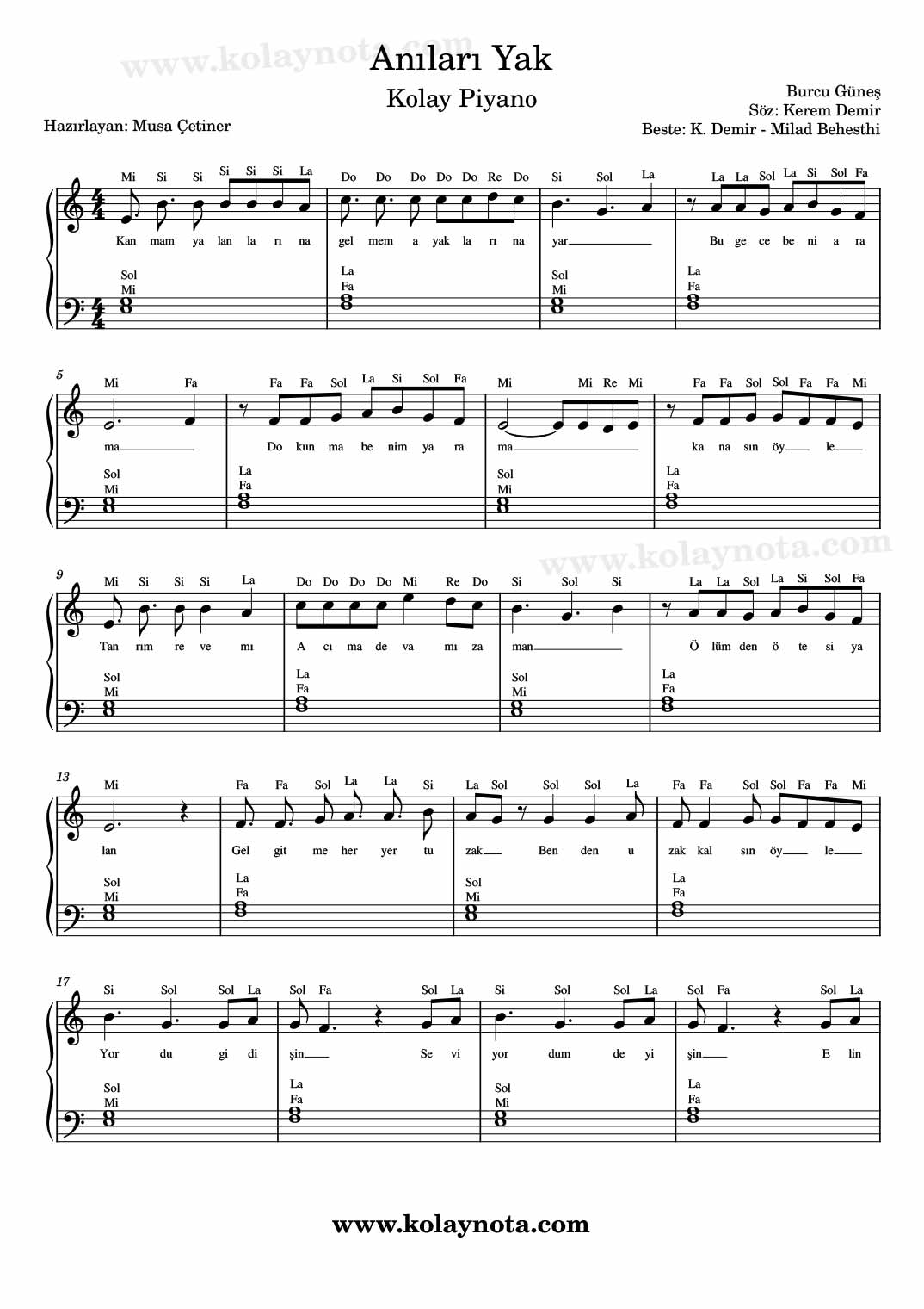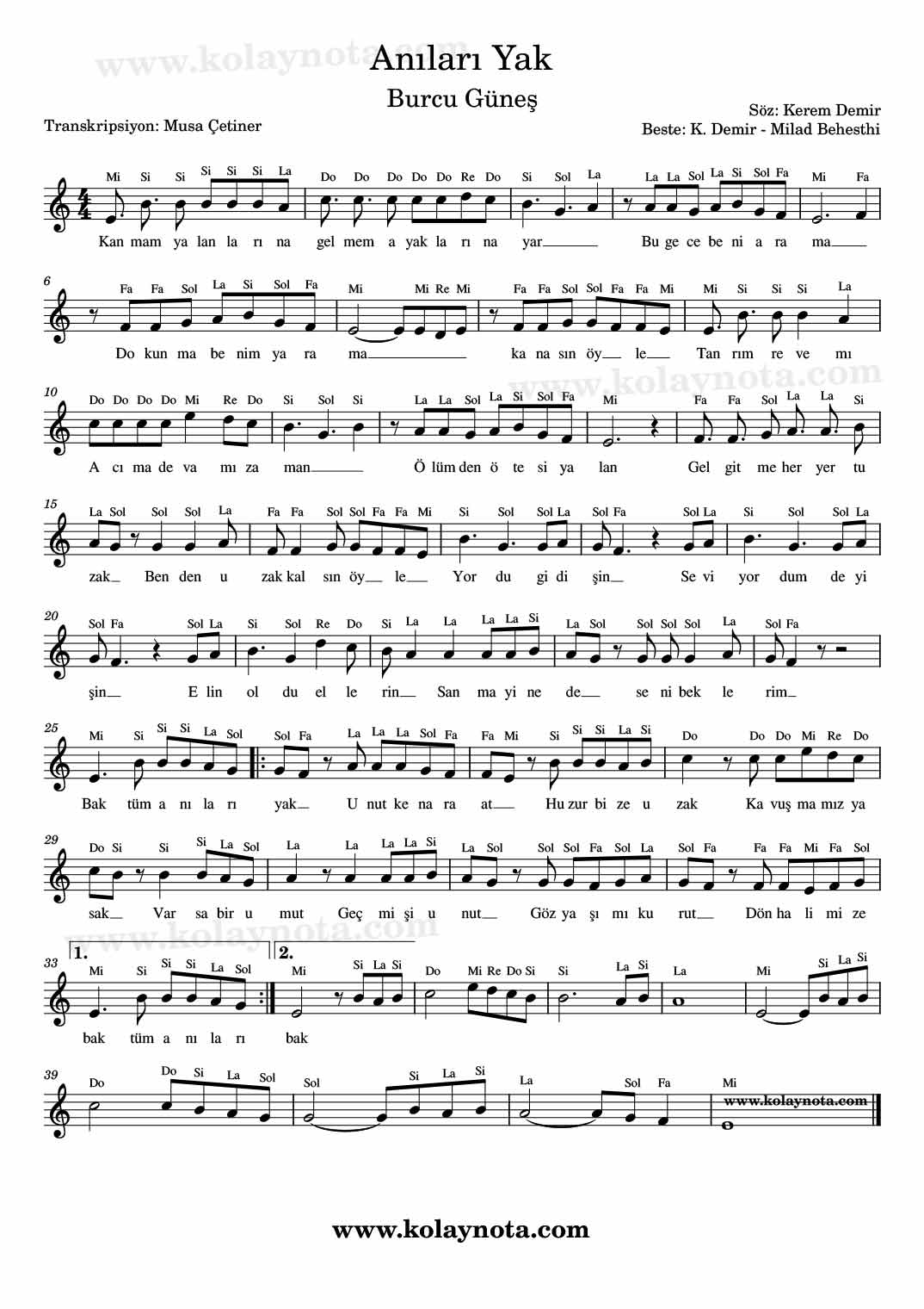 Anıları Yak, Nota. Burcu Güneş’in bir şarkısı. Sözleri Kerem Demir, bestesi K. Demir ve Milad Behesthi’ye ait. Kürdi dizisi üzerine bestelenmiş ve Do# karar sesinde yorumlanmış. Ben Mi karar sesinde notaya aldım. Kolay nota ve piyano düzenlemesini görebilirsiniz.