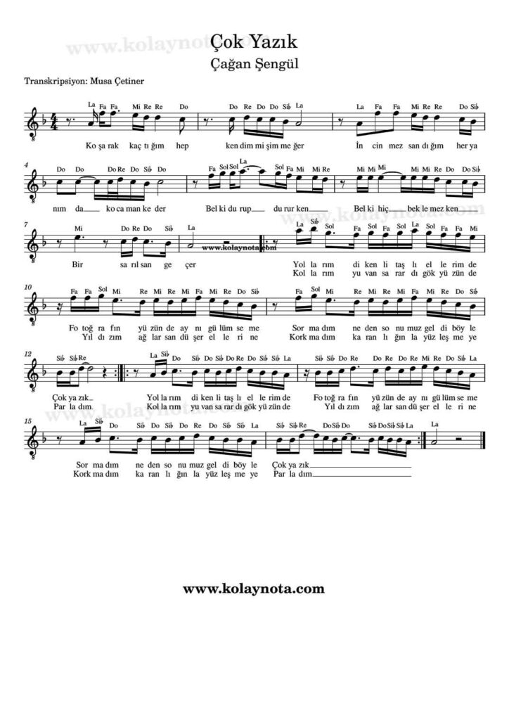 Çok Yazık, Nota. Çağan Şengül’ün bir şarkısı. Re Minör tonunda yorumlanmış, aynı tonda Kolay Nota ve Piyano düzenlemesini hazırladım.