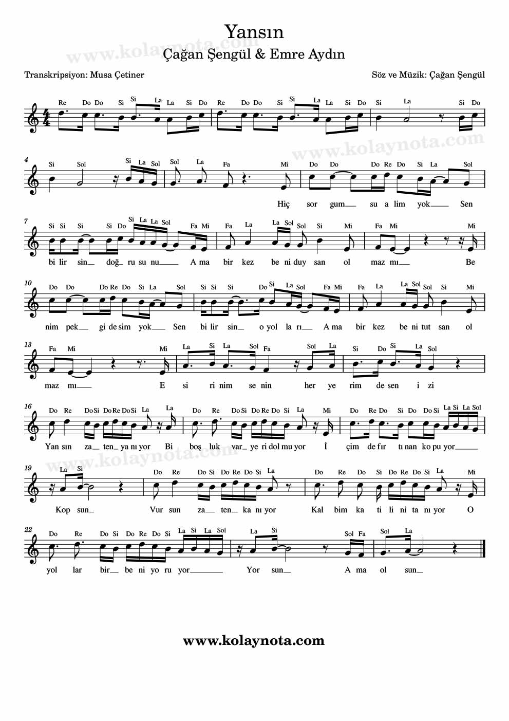 Yansın, Nota. Sözü ve müziği Çağan Şengül’e ait olan ve Emre Aydın’la beraber seslendirdikleri bir şarkı. Fa karar sesinde söylenmiş, ben La karar sesinde notaya aldım. Keman, melodika, flüt, org gibi çalgılarda çalabilir, notasyonu dinleyerek çalışabilirsiniz.