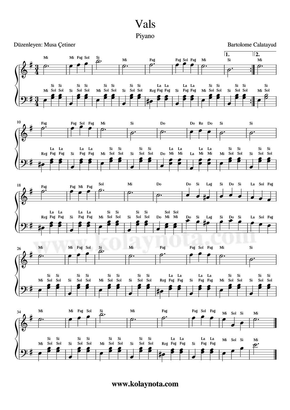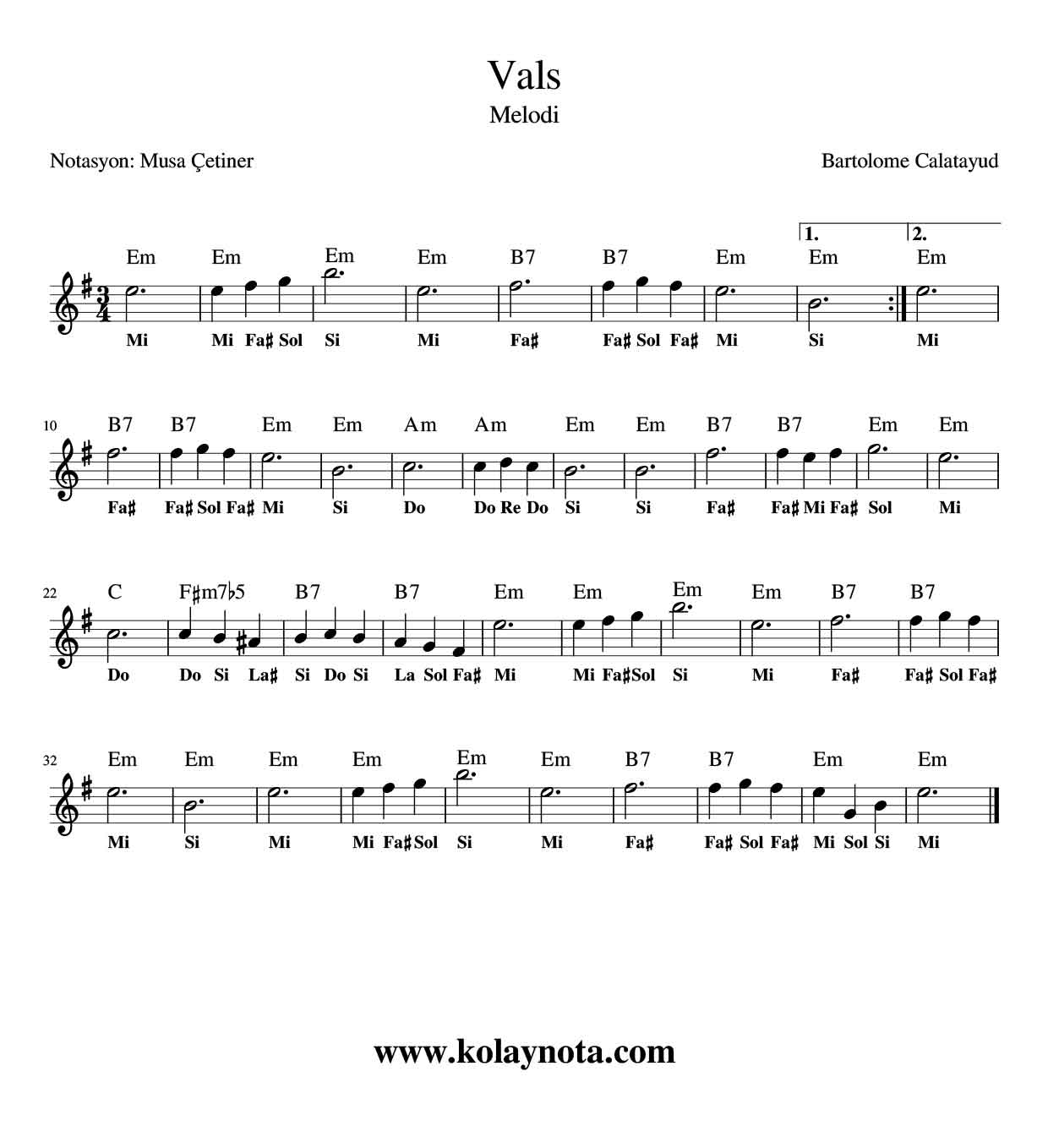 Vals, gitarist ve besteci Bartolome Calatayud’un bir eseri. Kolay notası ve piyano notalarını paylaşacağım bu yazıda. Notaları şarkının da orjinal tonu olan Mi minör tonunda hazırladım.