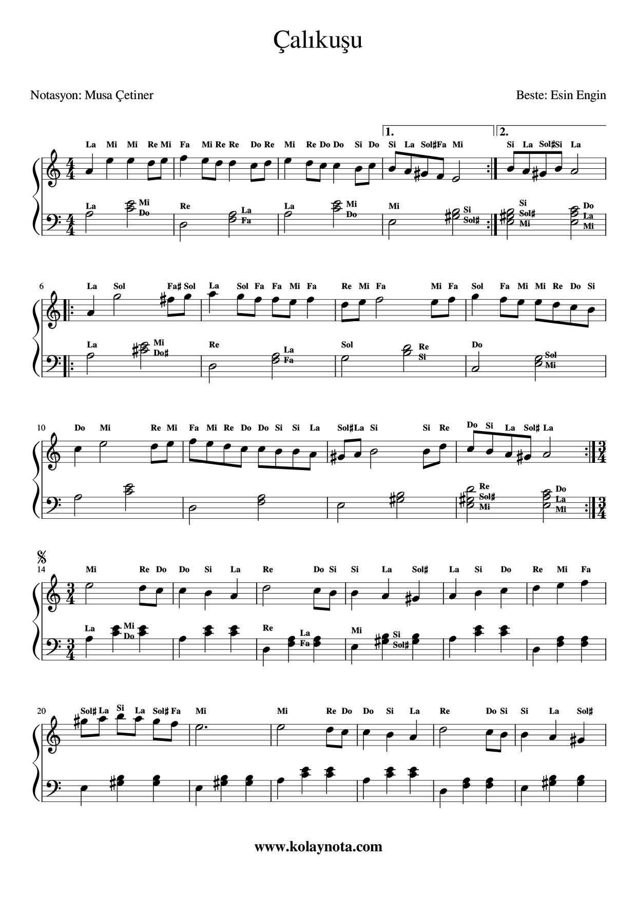 Çalıkuşu; bestesi Esin Engin‘e ait ve çok sevilen bir melodi. Akor eşlikli piyano notası biçiminde düzenledim. Eşlik zor değil, ilk aşamada biraz yavaş çalarak kolayca çözebilirsiniz diye düşünüyorum. Youtube videosunu da ekliyorum, çalınışı hakkında fikir sahibi olabilirsiniz. Başarılar.