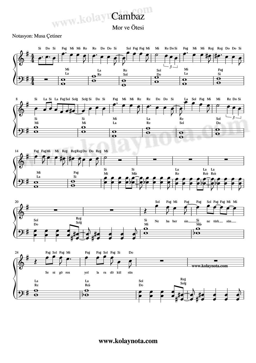 Cambaz; Mor ve Ötesi grubunun çok sevilen bir şarkısı. Piyano notalarını paylaşacağım bu yazıda. Kolay piyano biçiminde düzenledim şarkıyı fakat yine de biraz zorlayabilir. Düzenlemeyi Mi minör tonunda hazırladım. Youtube videosunu da ekliyorum, şarkının çalınışı hakkında bir fikir verecektir size.