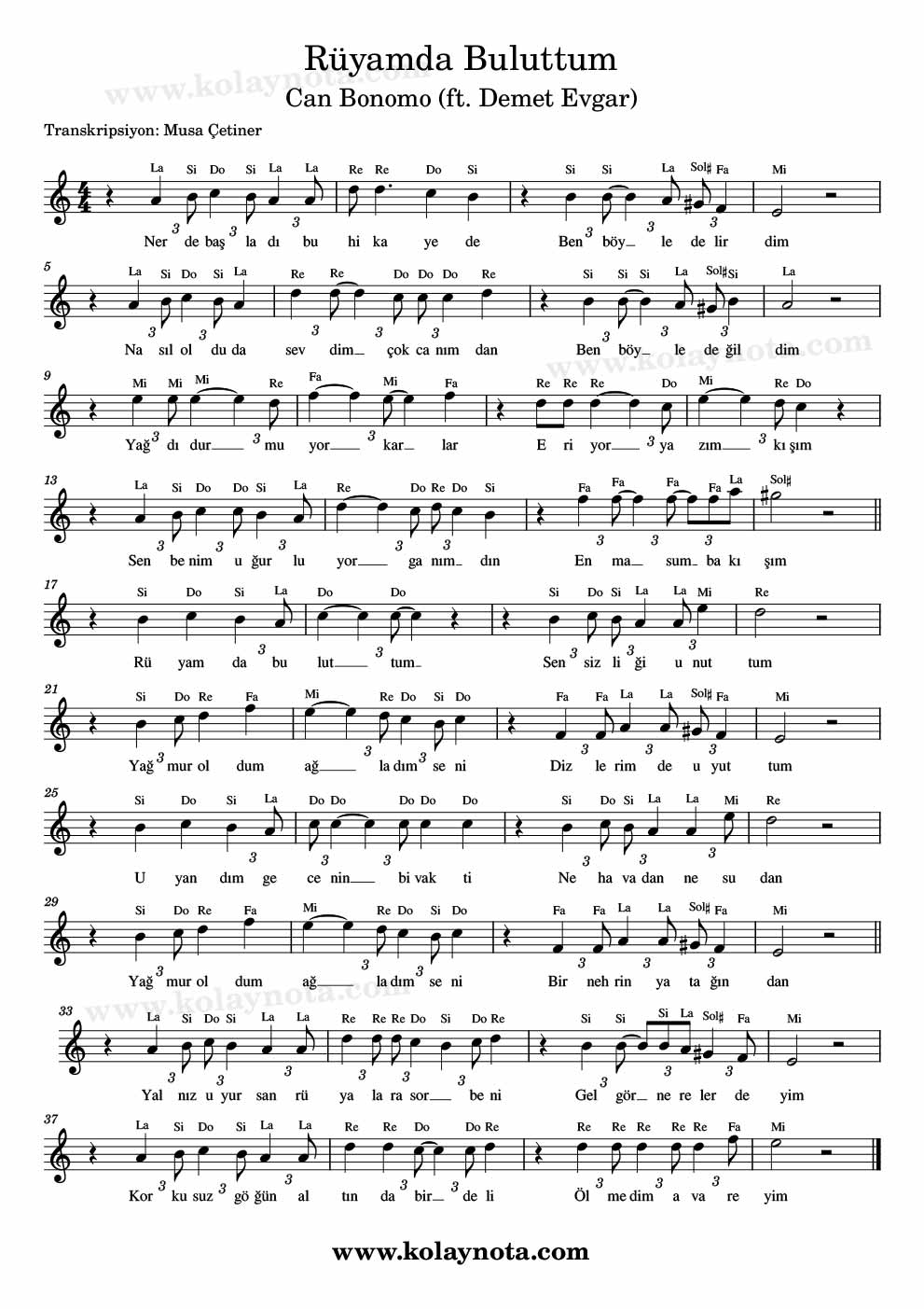 Rüyamda Buluttum, Nota. Can Bonomo’nun Demet Evgar’la beraber seslendirdiği bir şarkı. 2021 yılında dinleyicilere ulaşmış. La Karar sesinde notaya aldım. Kolay notasyonunu görebilir, notasyonu dinleyerek doğru bir şekilde çalışabilirsiniz.