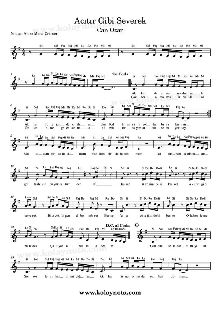 Acıtır Gibi Severek, Nota. Sözü ve müziği Can Ozan’a ait bir şarkı. Sanatçı şarkıyı Mi minör tonunda yorumlamış, aynı tonda notasını yazdım. Kolay notasyonunu görebilirsiniz bu yazıda. PDF ve imaj biçiminde görebilir, keman, melodika, flüt, org gibi çalgılarda çalabilirsiniz.