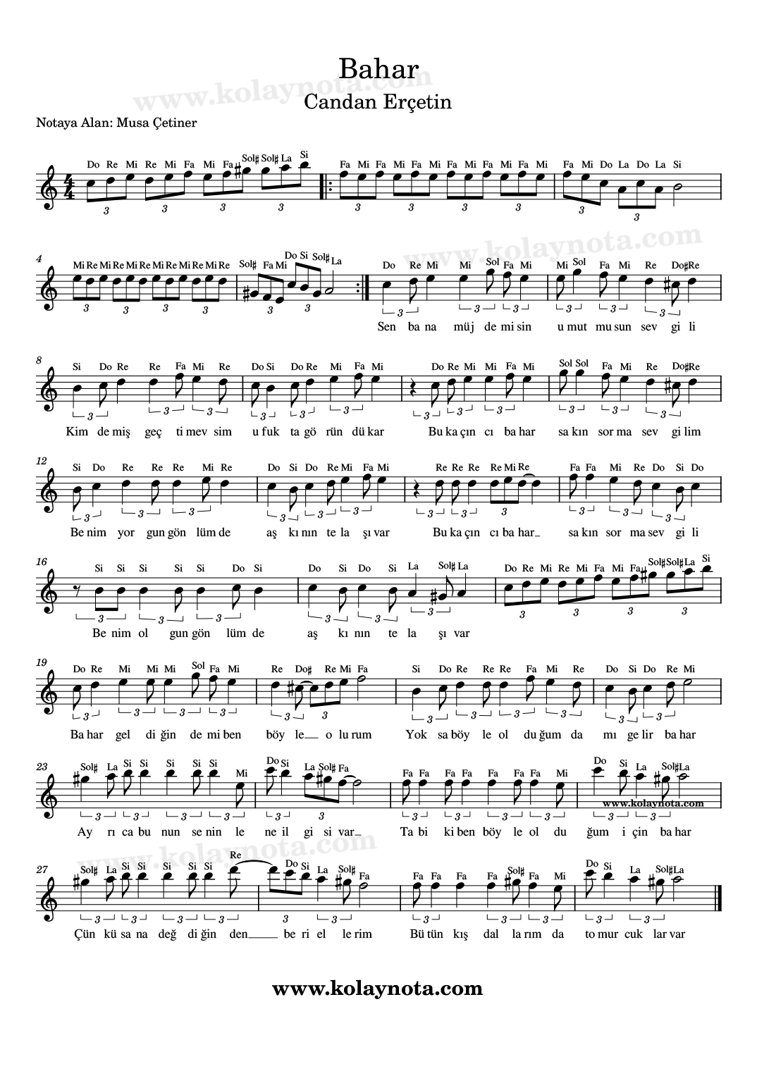 Bahar, Nota. Candan Erçetin’in bir şarkısı. Bestesi C. Erçetin, sözleri Ayşe Kulin’e ait. Sanatçının 2009 yılında çıkan “Kırık Kalpler Durağında” albümünde yer almış. La minör tonunda notaya aldım.