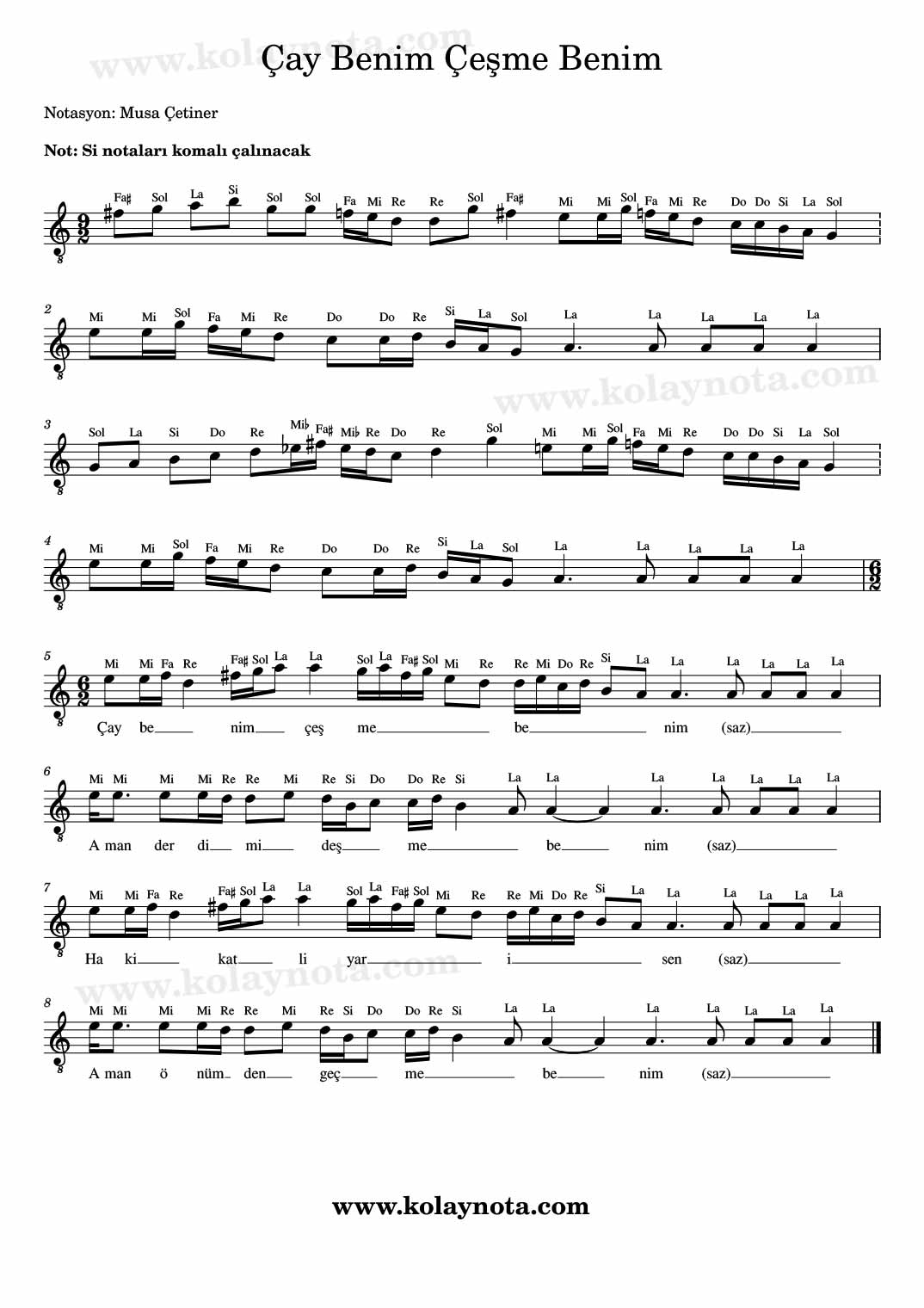 Çay Benim Çeşme Benim, Nota. Antalya / Korkuteli yöresine ait, kaynak kişisi Fahrettin Çelik olan, aşk ve sevda temalı bir türkü. Gülizar makamında ve 9/2 – 6/2 ölçü birimlerine sahip. La karar sesinde kolay notasını ve TRT notasını görebilirsiniz.