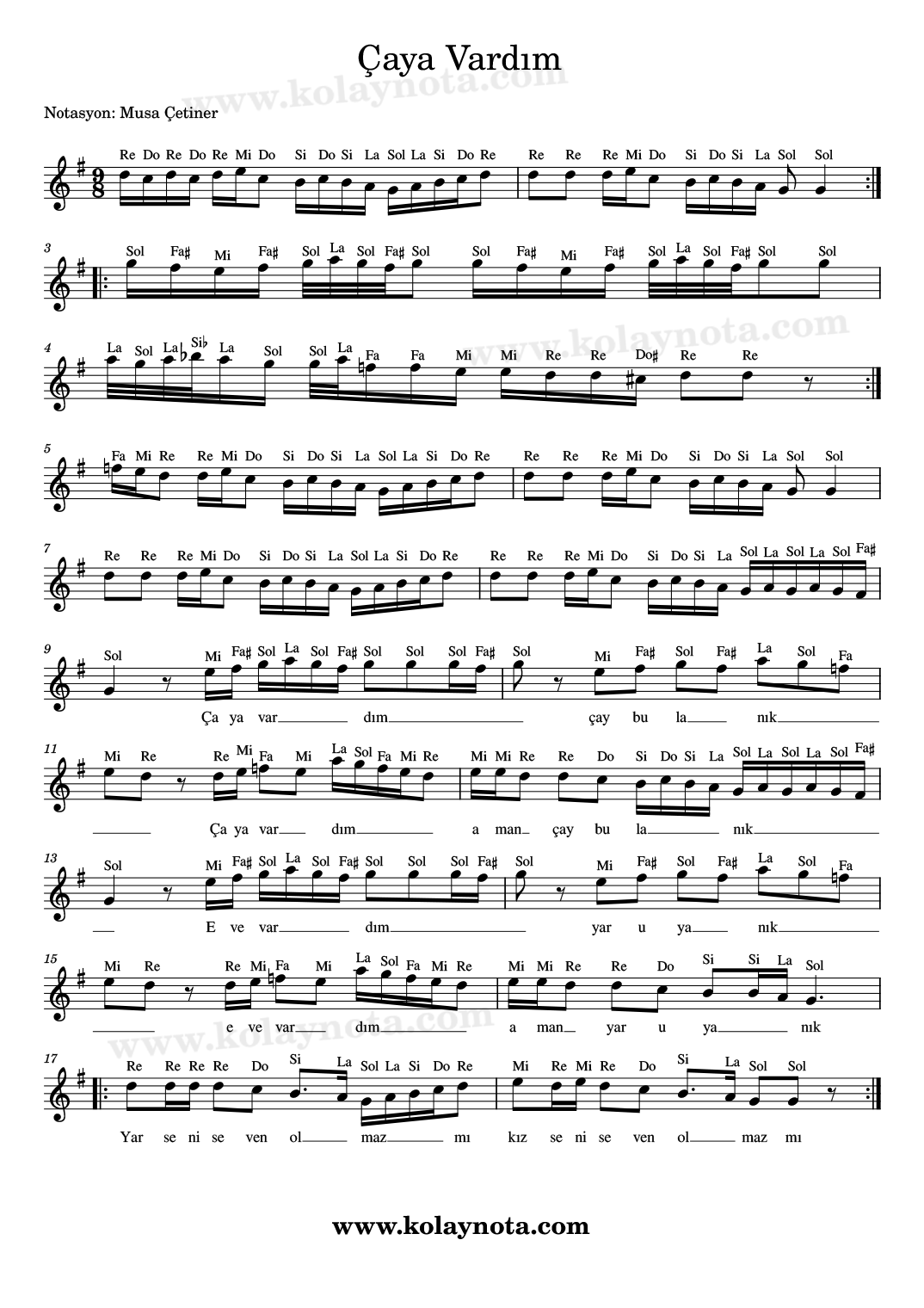 Çaya Vardım Çay Bulanık, Nota. Mahur makamında ve 9/8 ölçü biriminde bir türkü. Mersin / Silifke yöresinden derlenmiş. Sol karar sesinde notaya aldım. PDF ve imaj biçiminde görebilir, bağlama, keman, flüt, melodika, org gibi çalgılarda çalabilirsiniz.