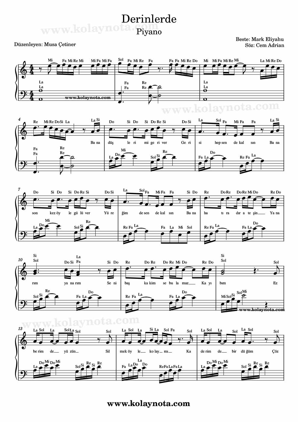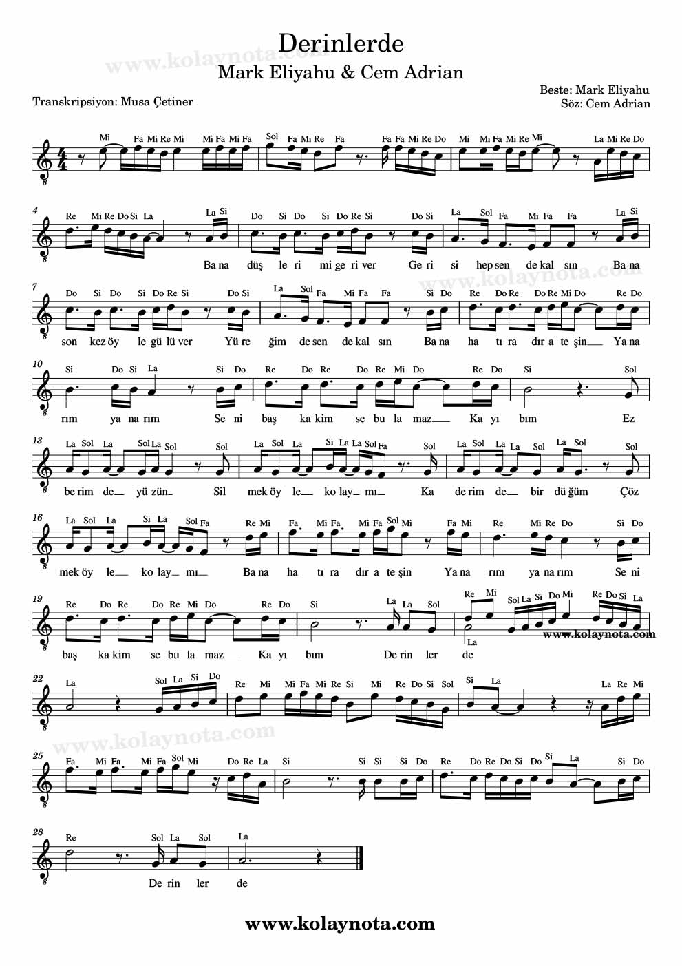 Derinlerde, Nota. Bestesi Mark Eliyahu, sözleri Cem Adrian’a ait bir şarkı. Do karar sesinde yorumlanmış, ben La karar sesinde notaya aldım. Kolay nota ve piyano düzenlemesini görebilirsiniz bu yazıda.