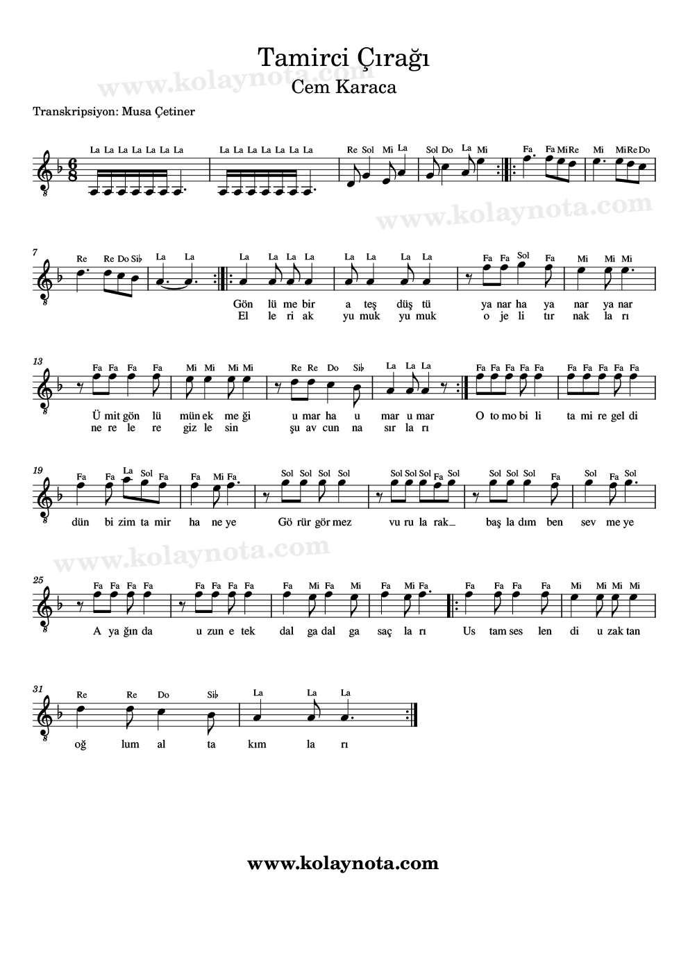 Tamirci Çırağı, Nota. Cem Karaca’nın şarkısı. 1975 yılında çıkan aynı adlı plakta yer almış. Sözü ve müziği sanatçıya ait. Frigyan modunda bestelenmiş, Mib karar sesinde yorumlanmış. Ben La karar sesinde notaya aldım. Notasyonu keman, piyano, melodika, flüt, org gibi çalgılarda çalabilir, PDF ve imaj biçimlerinde görüntüleyebilirsiniz.