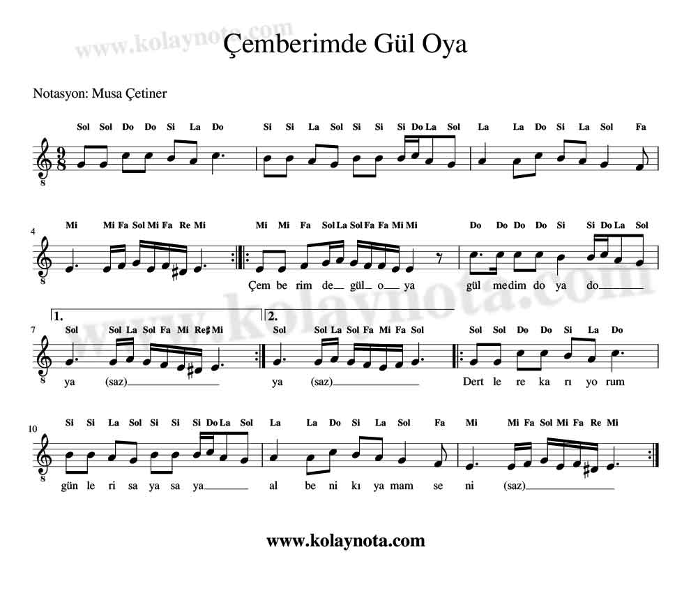 Çemberimde Gül Oya 9/8 ölçü birimine sahip, Çanakkale yöresine ait hareketli bir türkümüz. Do Re Mi nota ve kolay notasını paylaşıyorum. Melodika, keman, org, flüt gibi çalgılarda kolaylıkla çalabilirsiniz.