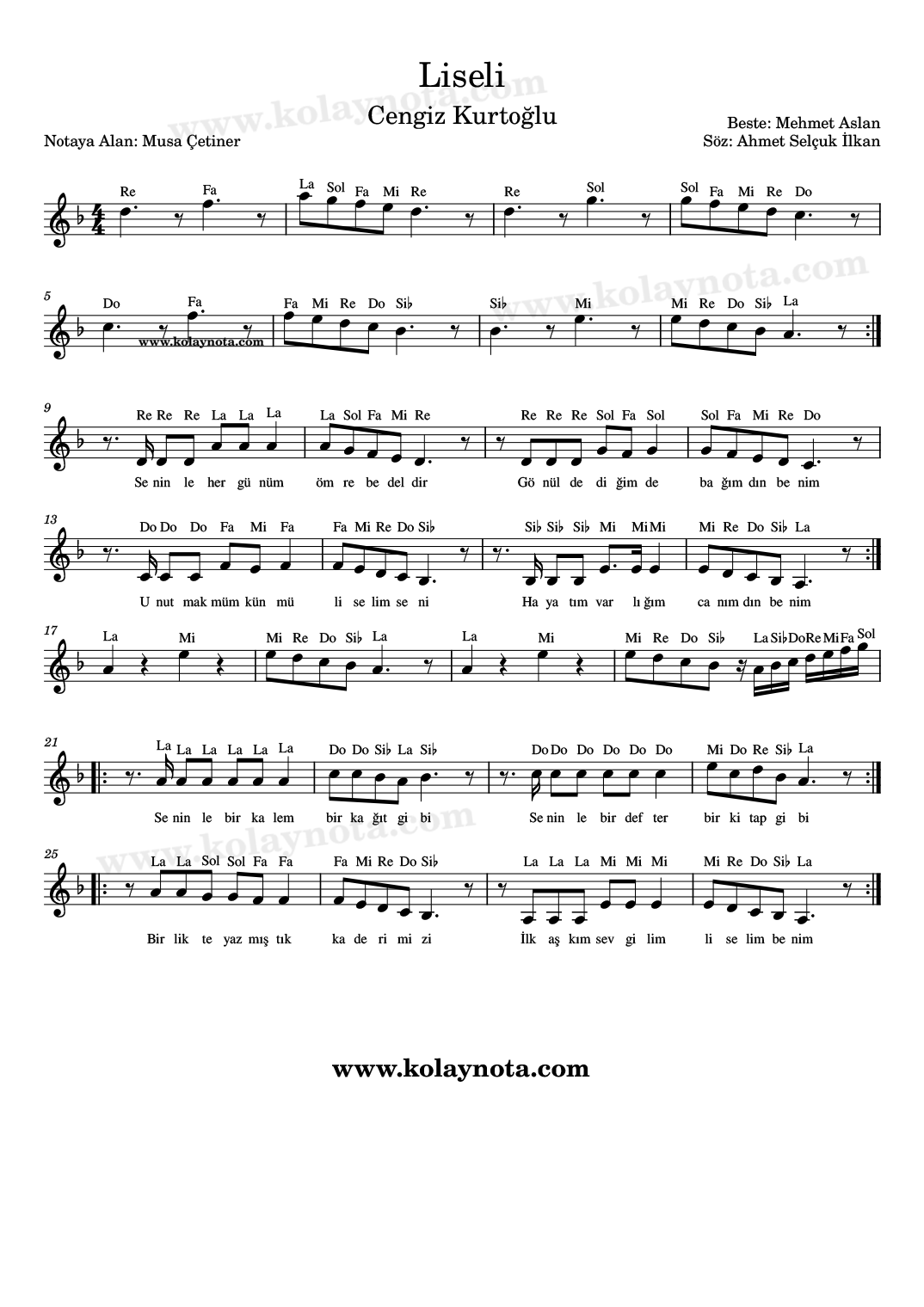 Liselim, Nota. Bestesi Ahmet Aslan, güftesi Ahmet Selçuk İlkan’a ait olan ve Cengiz Kurtoğlu’nun seslendirdiği bir şarkı. Kürdi makamında bestelenmiş, La karar sesinde notaya aldım. Keman, melodika, piyano, flüt, org gibi çalgılarda çalabilir, PDF ve imaj biçiminde görüntüleyebilirsiniz.