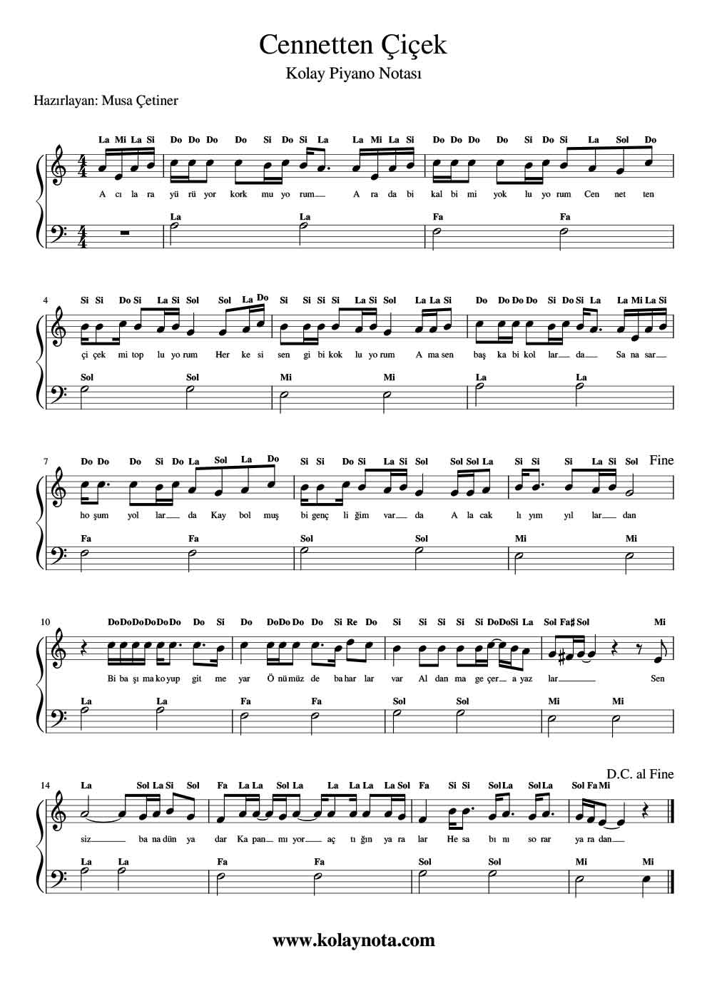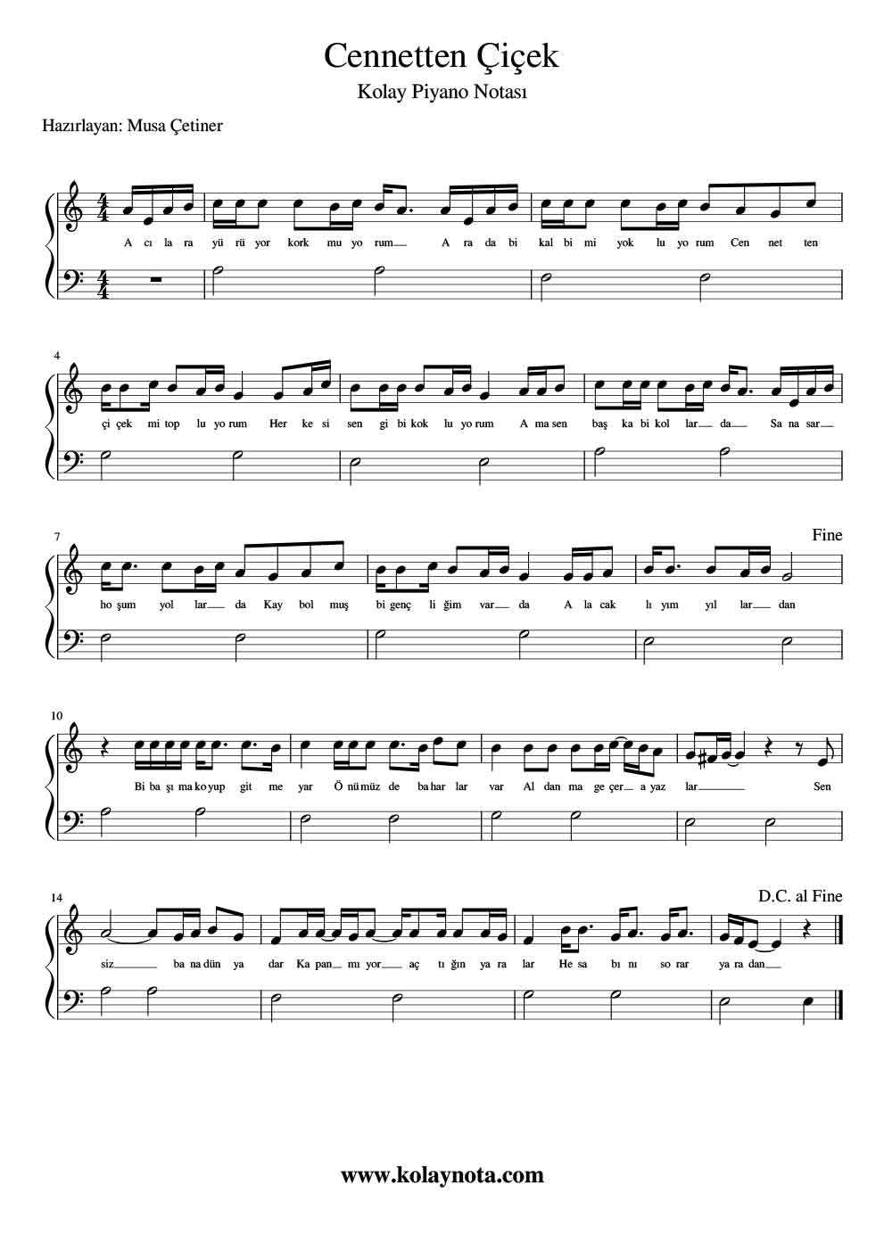 Cennetten Çiçek – Kolay Piyano Notası